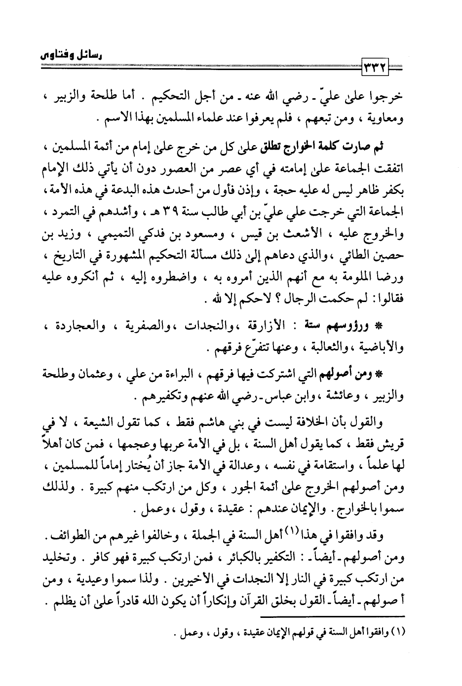 ثم صارت كلمة الخوارج تطلق على كل من خرج على إمام من أئمة المسلمين اتفقت الجماعة على إمامته في أي عصر من العصور دون أن يأتي ذلك الإمام بكفر ظاهر ليس له عليه حجة، وإذن فأول من أحدث هذه البدعة في هذه الأمة الجماعة التي خرجت على علي بن أبي طالب سنة 39 هـ، وأشدهم في التمرد، والخروج عليه، الأشعث بن قيس، ومسعود بن فدكي التميمي، وزيد بن حصين الطائي، والذي دعاهم إلى ذلك مسألة التحكيم المشهورة في التاريخ، ورضا الملومة به مع أنهم الذين أمروه به، واضطروه إليه، ثم أنكروه عليه فقالوا: لم حكمت الرجال؟ لا حكم إلا لله. رءوسهم ستة: الأزارقة، والنجدات، والصفرية، والعجاردة، والأباضية، والثعالبة، وعنها تتفرع فرقهم.