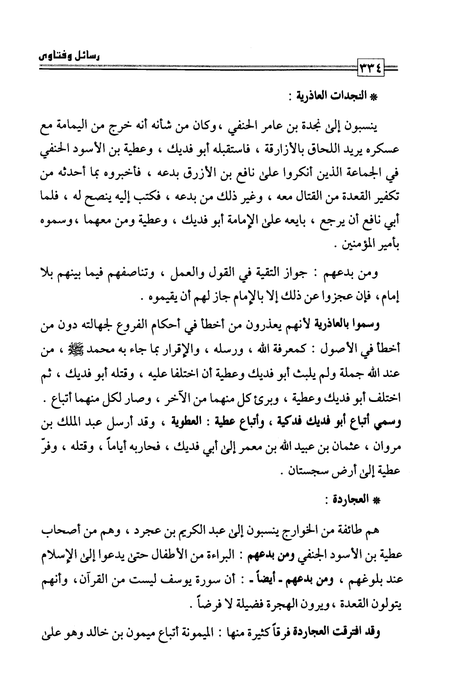 وسموا بالعاذرية؛ لأنهم يعذرون من أخطأ في أحكام الفروع لجهالته دون من أخطأ في الأصول: كمعرفة الله، ورسله، والإقرار بما جاء به محمد صلى الله عليه وسلم من عند الله جملة، ولم يلبث أبو فديك وعطية أن اختلفا وبرئ كل منهما من الآخر، وصار لكل منهما أتباع، وسمي أتباع أبو فديك فدكية، وأتباع عطية: العطوية، وقد أرسل عبد الملك بن مروان، عثمان بن عبيد الله بن معمر إلى أبي فديك، فحاربه أياما وقتله، وفر عطية إلى أرض سجستان.