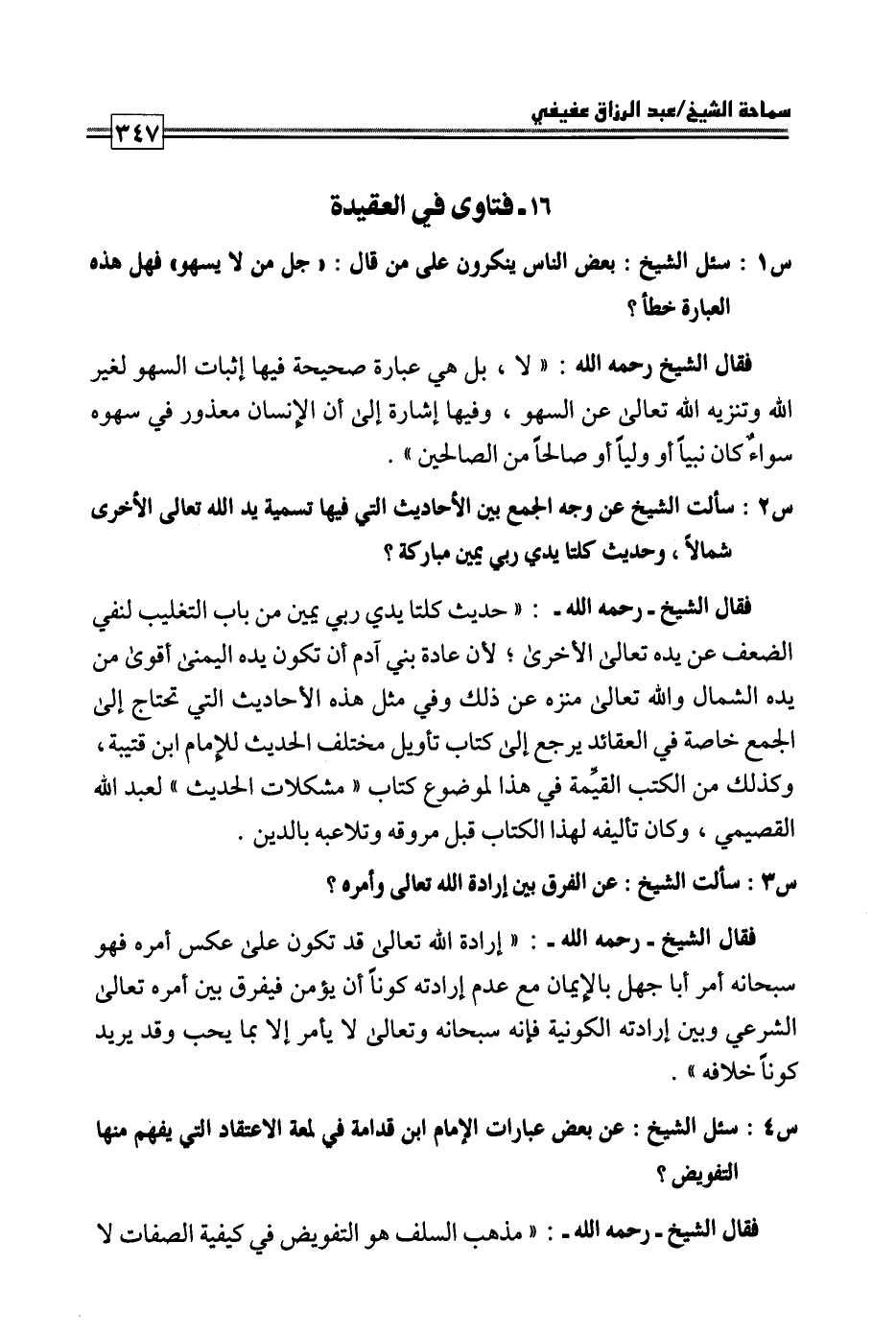 كتاب فتاوى ورسائل سماحة الشيخ عبد الرزاق عفيفي - قسم العقيدة