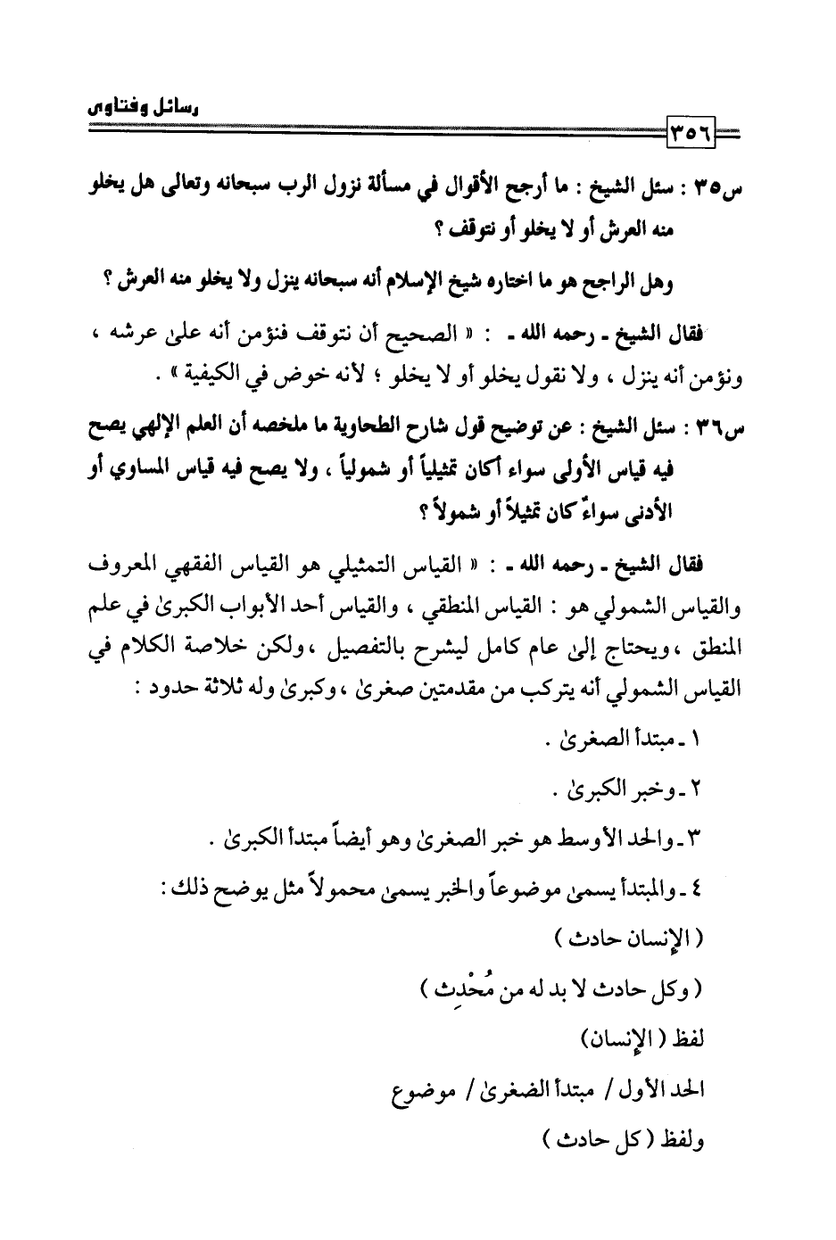 س 36: سئل الشيخ: عن توضيح قول شارح الطحاوية ما ملخصه: أن العلم الإلهي يصح فيه قياس الأولى سواء أكان تمثيليا أو شموليا، ولا يصح فيه قياس المساوي أو الأدنى سواء كان تمثيلا أو شمولا؟