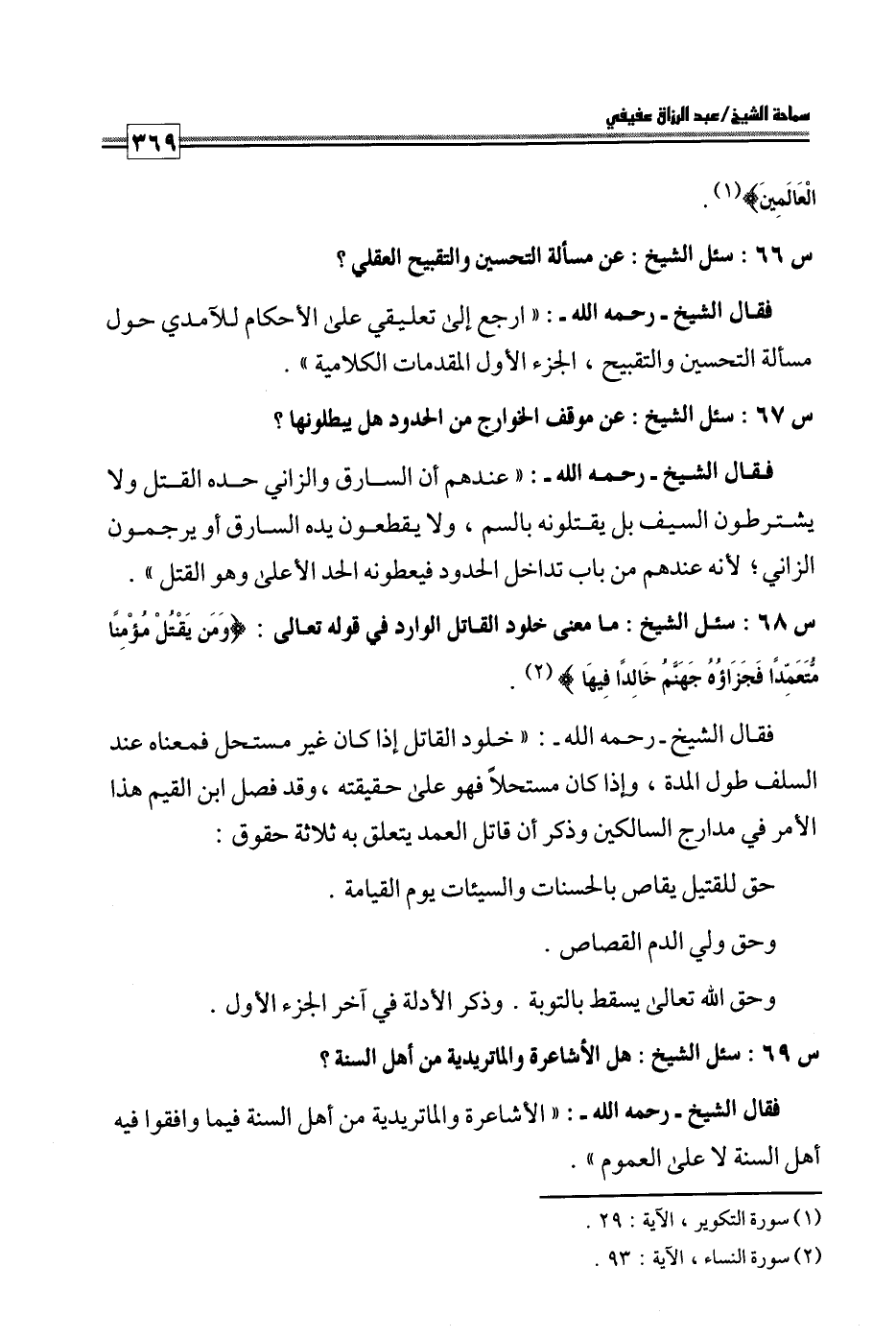 كتاب فتاوى ورسائل سماحة الشيخ عبد الرزاق عفيفي - قسم العقيدة