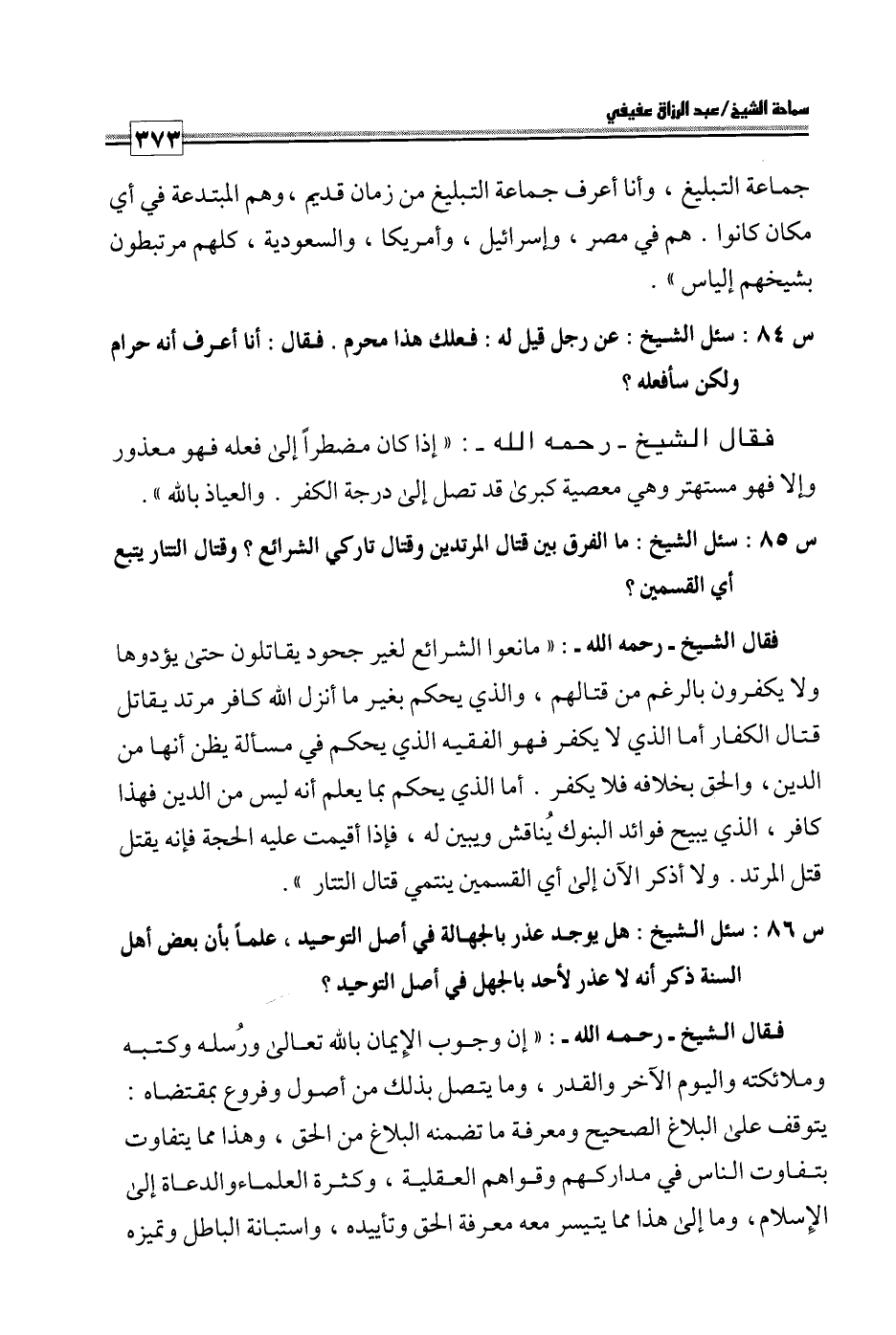 س 85: سئل الشيخ: ما الفرق بين قتال المرتدين وقتال تاركي الشرائع؟ وقتال التتار يتبع أي القسمين؟