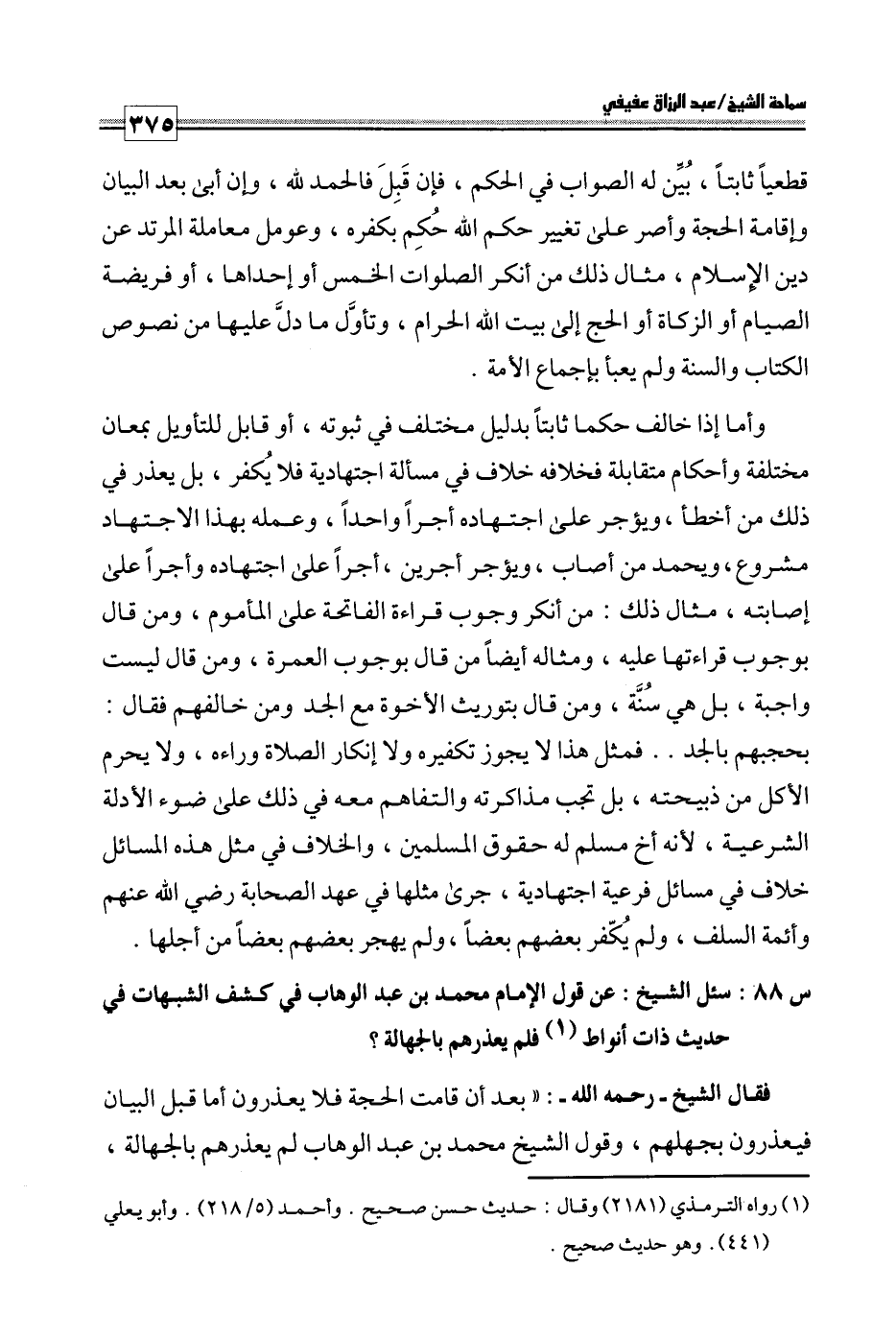س 88: سئل الشيخ عن قول الإمام محمد بن عبد الوهاب في كشف الشبهات في حديث ذات أنواط فلم يعذرهم بالجهالة؟