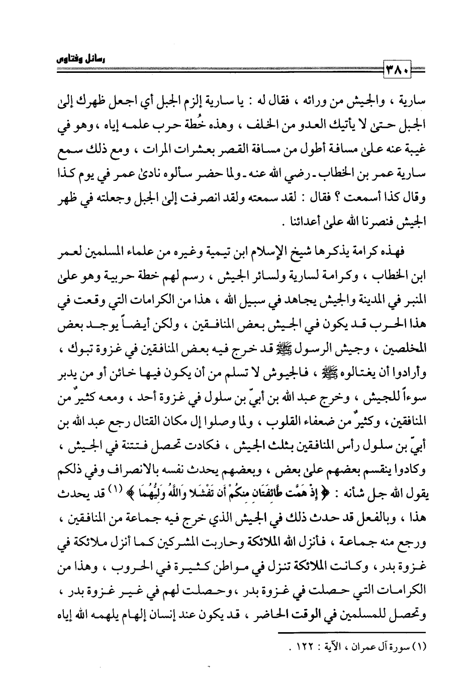 فهذه كرامة يذكرها شيخ الإسلام ابن تيمية وغيره من علماء المسلمين لعمر بن الخطاب، وكرامة لسارية ولسائر الجيش، رسم لهم خطة حربية وهو على المنبر في المدينة والجيش يجاهد في سبيل الله، هذا من الكرامات التي وقعت في هذا الحرب قد يكون في الجيش بعض المنافقين، ولكن أيضا يوجد بعض المخلصين، وجيش الرسول صلى الله عليه وسلم قد خرج فيه بعض المنافقين في غزوة تبوك، وأرادوا أن يغتالوه صلى الله عليه وسلم، فالجيوش لا تسلم من أن يكون فيها خائن أو من يدبر سوءا للجيش، وخرج عبد الله بن أبي ابن سلول في غزوة أحد، ومعه كثير من المنافقين، وكثير من ضعفاء القلوب، ولما وصلوا إلى مكان القتال رجع عبد الله بن أبي ابن سلول رأس المنافقين بثلث الجيش، فكادت تحصل فتنة في الجيش، وكادوا ينقسم بعضهم على بعض، وبعضهم يحدث نفسه بالانصراف وفي ذلكم يقول الله جل شأنه: {إِذْ هَمَّتْ طَائِفَتَانِ مِنْكُمْ أَنْ تَفْشَلَا وَاللَّهُ وَلِيُّهُمَا} قد يحدث هذا، وبالفعل قد حدث ذلك في الجيش الذي خرج فيه جماعة من المنافقين، ورجع منه جماعة، فأنزل الله الملائكة وحاربت المشركين كما أنزل ملائكة في غزوة بدر، وكانت الملائكة تنزل في مواطن كثيرة في الحروب، وهذا من الكرامات التي حصلت في غزوة بدر، وحصلت لهم في غير غزوة بدر، وتحصل للمسلمين في الوقت الحاضر، وقد يكون عند إنسان إلهام يلهمه الله إياه