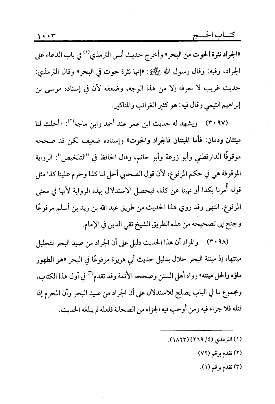 3098 - والمراد أن هذا الحديث دليل على أن الجراد من صيد البحر لتحليل ميتتها، إذ ميتتة البحر حلال بدليل حديث أبي هريرة مرفوعًا في البحر «هو الطهور ماؤه والحل ميتته» رواه أهل السنن وصححه الأئمة وقد تقدم (¬3) في أول هذا الكتاب، ومجموع ما في الباب يصلح للاستدلال على أن الجراد من صيد البحر وأن المحرم إذا قتله فلا جزاء فيه ومن أوجب فيه الجزاء من الصحابة فلعله لم يبلغه الحديث.