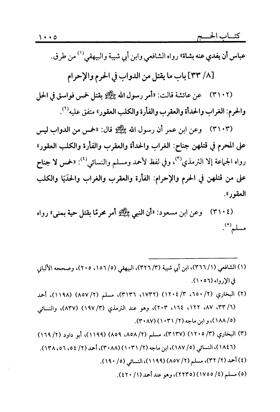 3104 - وعن ابن مسعود: «أن النبي - صلى الله عليه وسلم - أمر محرمًا بقتل حية بمنى» رواه مسلم (¬5) .