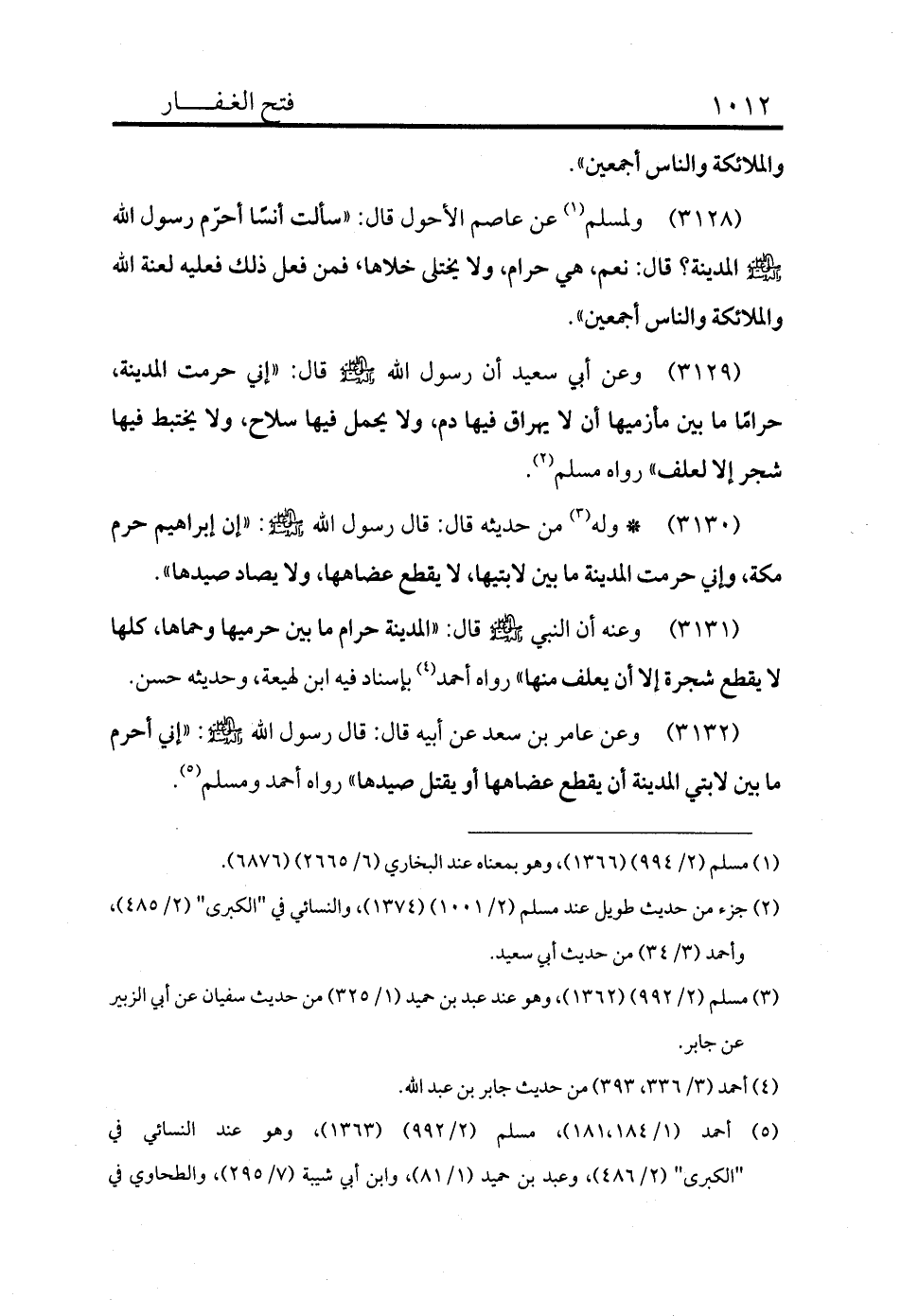 3131 - وعنه (*) أن النبي - صلى الله عليه وسلم - قال: «المدينة حرام ما بين حرميها وحماها، كلها لا يقطع شجرة إلا أن يعلف منها» رواه أحمد (¬4) بإسناد فيه ابن لهيعة، وحديثه حسن.