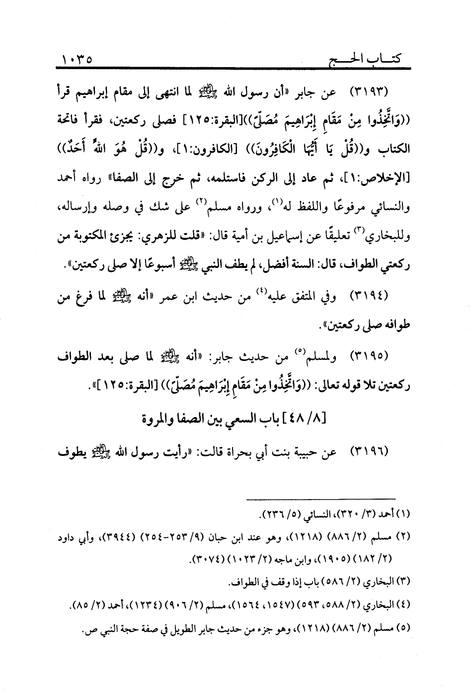 3193 - عن جابر «أن رسول الله - صلى الله عليه وسلم - لما انتهى إلى مقام إبراهيم قرأ ((وَاتَّخِذُوا مِنْ مَقَامِ إِبْرَاهِيمَ مُصَلّىً)) [البقرة:125] فصلى ركعتين فقرأ فاتحة الكتاب و ((قُلْ يَا أَيُّهَا الْكَافِرُونَ)) [الكافرون:1] ، و ((قُلْ هُوَ اللَّهُ أَحَدٌ)) [الإخلاص:1] ثم عاد إلى الركن فاستلمه ثم خرج إلى الصفا» رواه أحمد والنسائي مرفوعًا واللفظ له (¬1) ، ورواه مسلم (¬2) على شك في وصله وإرساله وللبخاري (¬3) تعليقًا عن إسماعيل بن أمية قال: «قلت للزهري: يجزئ المكتوبة من ركعتي الطواف قال السنة أفضل لم يطف النبي - صلى الله عليه وسلم - أسبوعًا إلا صلى ركعتين» .