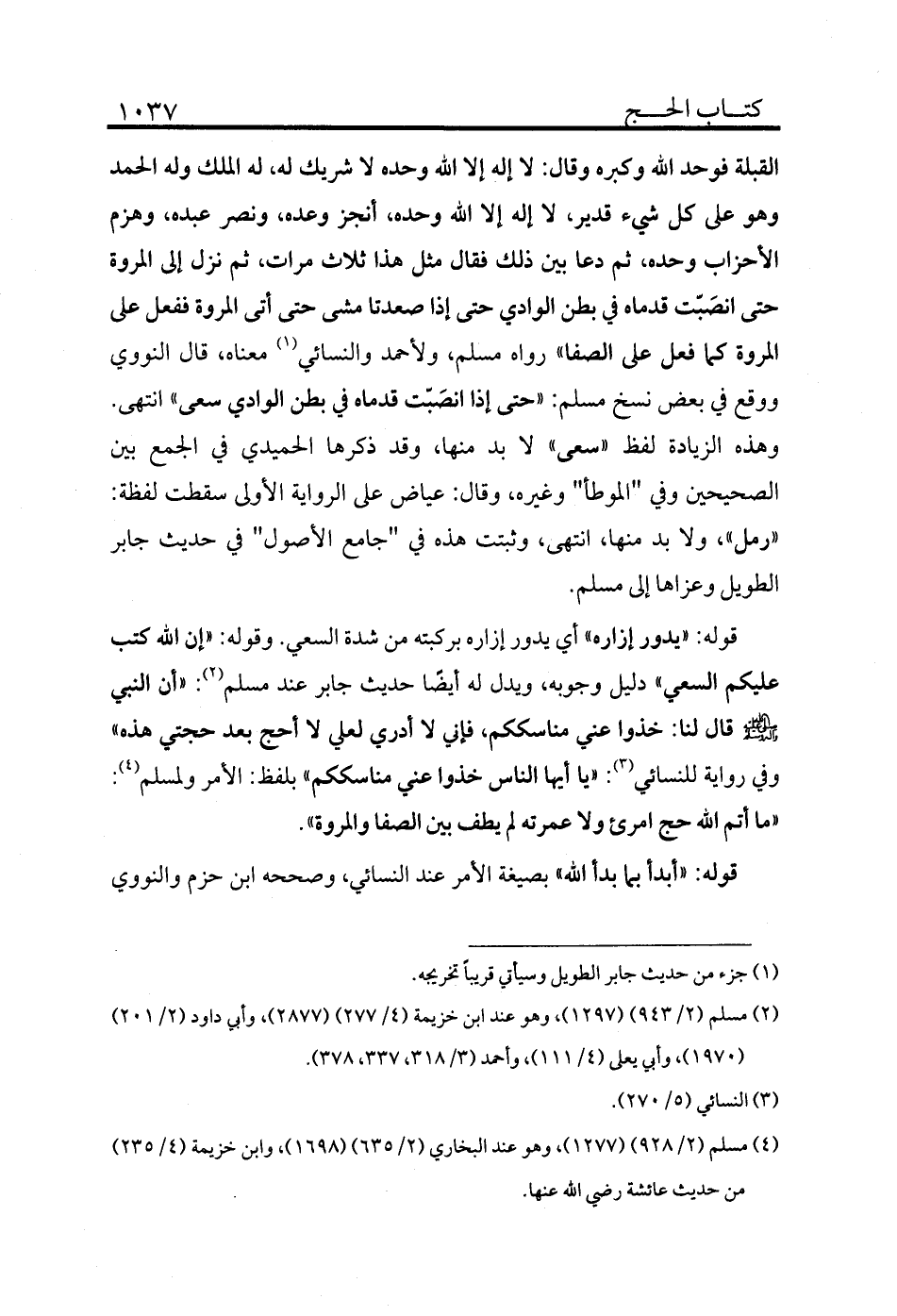 القبلة فوحد الله وكبره وقال: لا إله إلا الله وحده لا شريك له، له الملك وله الحمد وهو على كل شيء قدير، لا إله إلا الله وحده أنجز وعده، ونصر عبده، وهزم الأحزاب وحده، ثم دعا بين ذلك فقال مثل هذا ثلاث مرات، ثم نزل إلى المروة حتى انصَبّت قدماه في بطن الوادي حتى إذا صعدتا مشى حتى أتى المروة ففعل على المروة كما فعل على الصفا» رواه مسلم، ولأحمد والنسائي (¬1) معناه، قال النووي ووقع في بعض نسخ مسلم: «حتى إذا انصَبّت قدماه في بطن الوادي سعى» انتهى. وهذه الزيادة لفظ «سعى» لا بد منها وقد ذكرها الحميدي في الجمع بين الصحيحين وفي "الموطأ" وغيره وقال: عياض على الرواية الأولى سقطت لفظة: «رمل» ، ولا بد منها، انتهى، وثبتت هذه في "جامع الأصول" في حديث جابر الطويل وعزاها إلى مسلم.