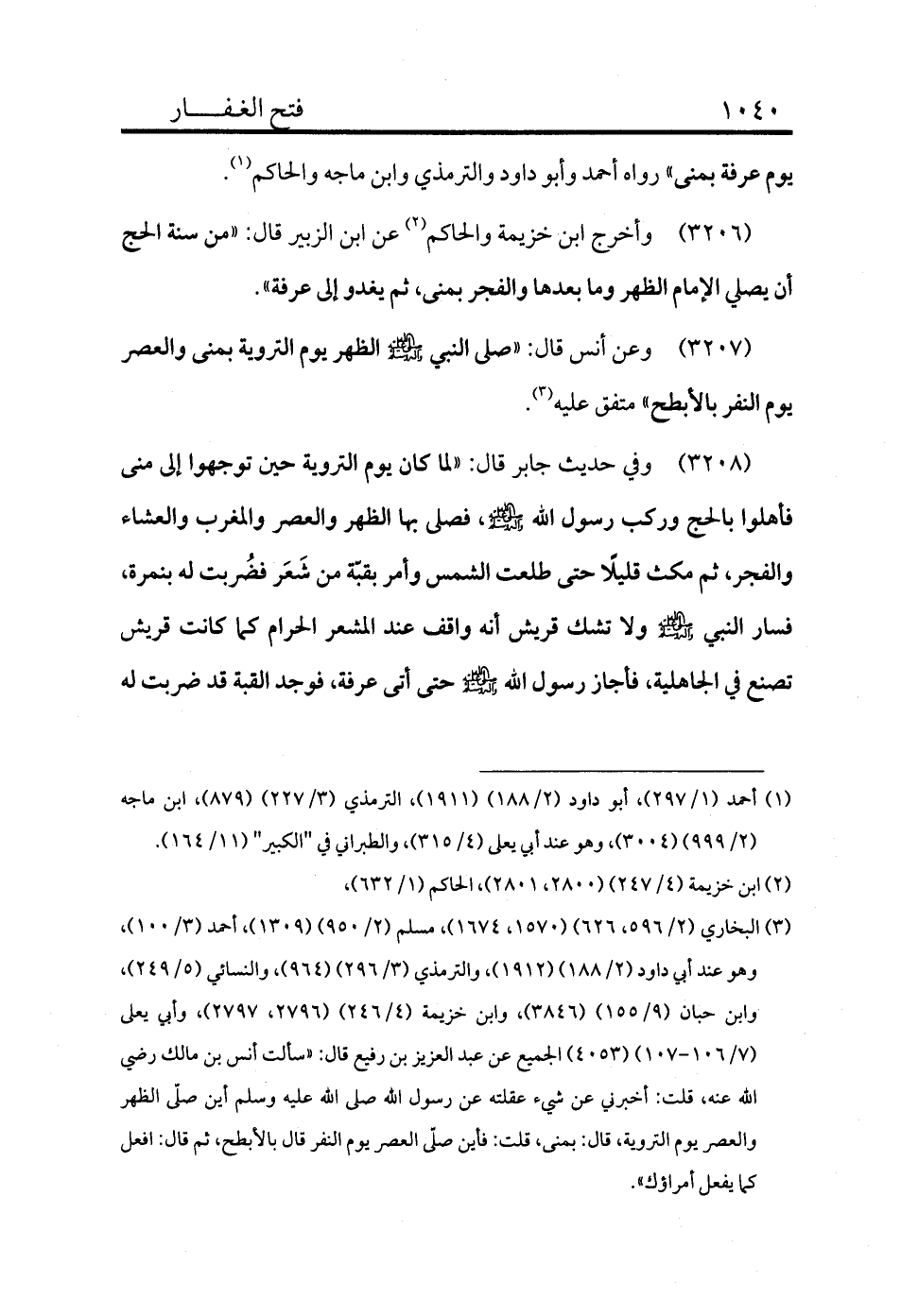3206 - وأخرج ابن خزيمة والحاكم (¬2) عن ابن الزبير قال: «من سنة الحج أن يصلي الإمام الظهر وما بعدها والفجر بمنى ثم يغدو إلى عرفة» .