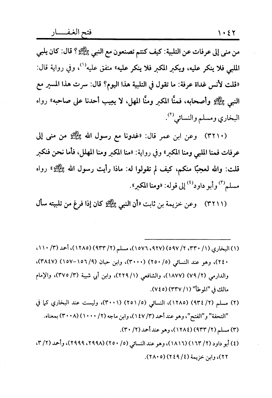 3210 - وعن ابن عمر قال: «غدونا مع رسول الله - صلى الله عليه وسلم - من منى إلى عرفات فمنا الملبي ومنا المكبر» وفي رواية: «منا المكبر ومنا المهلل فأما نحن فنكبر قلت: والله لعجبًا منكم، كيف لم تقولوا له ماذا رأيت رسول الله - صلى الله عليه وسلم -» رواه مسلم (¬3) وأبو داود (¬4) إلى قوله: «ومنا المكبر» .