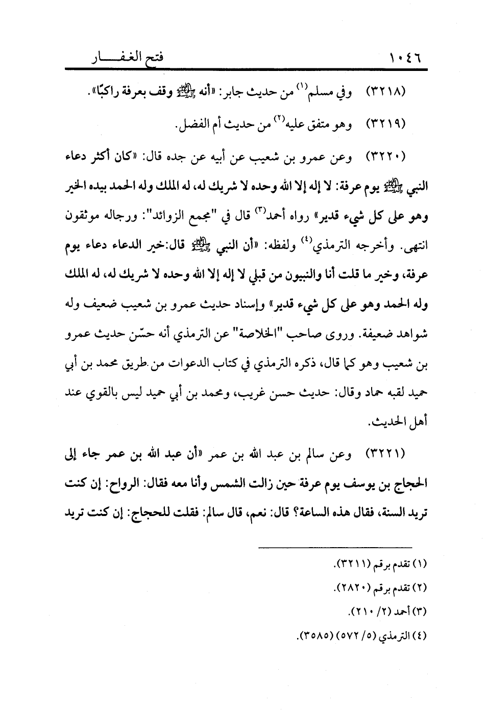 3220 - وعن عمرو بن شعيب عن أبيه عن جده قال: «كان أكثر دعاء النبي - صلى الله عليه وسلم - يوم عرفة: لا إله إلا الله وحده لا شريك له، له الملك وله الحمد بيده الخير وهو على كل شيء قدير» رواه أحمد (¬3) قال في "مجمع الزوائد": ورجاله موثقون انتهى. وأخرجه الترمذي (¬4) ولفظه: «أن النبي - صلى الله عليه وسلم - قال: خير الدعاء دعاء يوم عرفة، وخير ما قلت أنا والنبيون من قبلي لا إله إلا الله وحده لا شريك له، له الملك وله الحمد وهو على كل شيء قدير» وإسناد حديث عمرو بن شعيب ضعيف وله شواهد ضعيفة. وروى صاحب "الخلاصة" عن الترمذي أنه حسّن حديث عمرو بن شعيب وهو كما قال ذكره الترمذي في كتاب الدعوات من طريق محمد بن أبي حميد لقبه حماد وقال: حديث حسن غريب، ومحمد بن أبي حميد ليس بالقوي عند أهل الحديث.