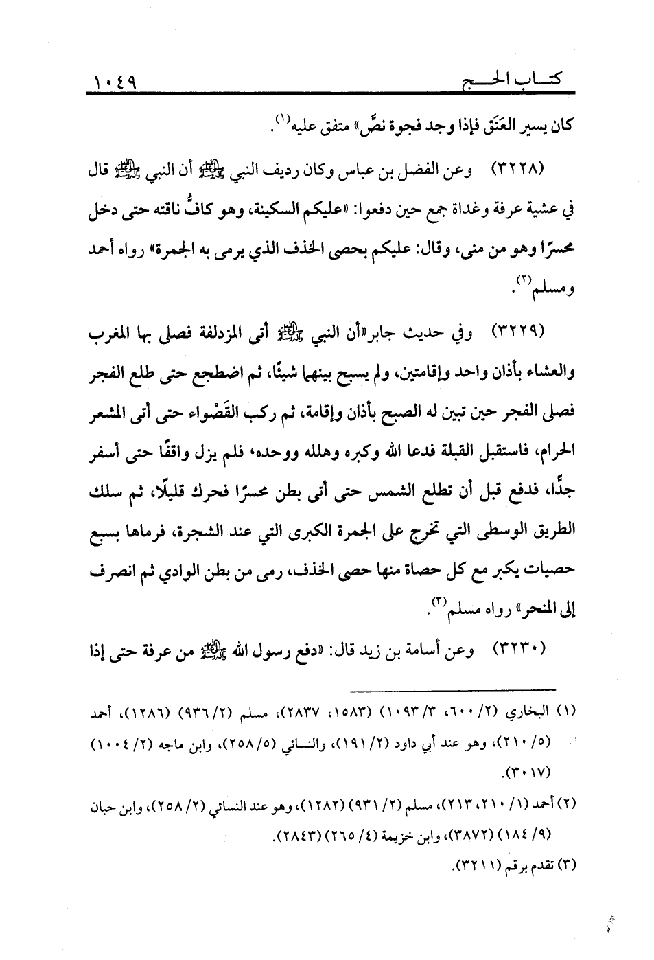 3230 - وعن أسامة بن زيد قال: «دفع رسول الله - صلى الله عليه وسلم - من عرفة حتى إذا
