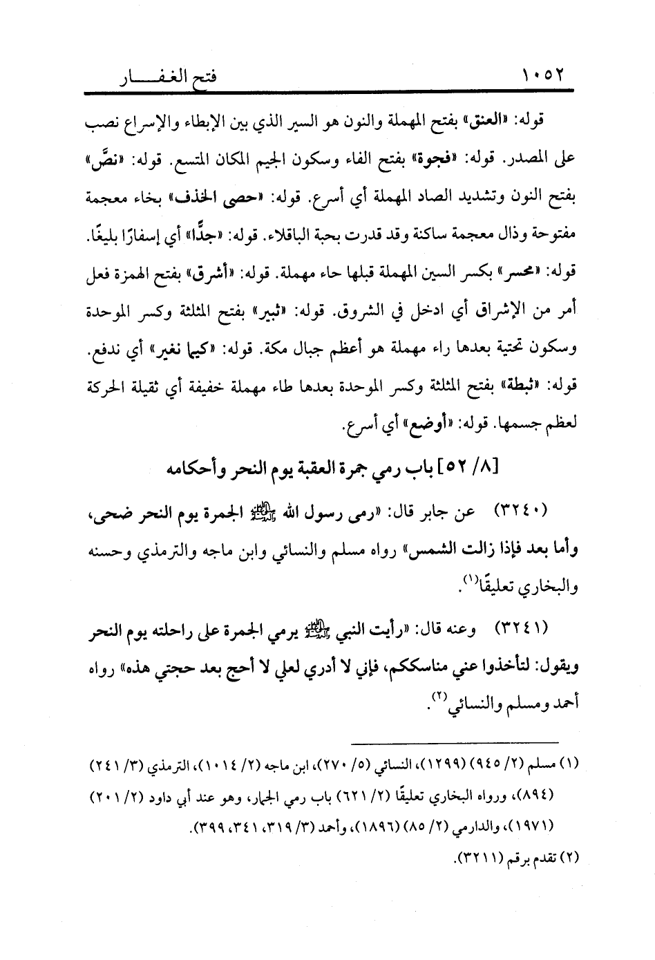 (¬1) مسلم (2/945) (1299) ، النسائي (5/270) ، ابن ماجه (2/1014) ، الترمذي (3/241) (894) ، ورواه البخاري تعليقًا (2/621) باب رمي الجمار، وهو عند أبي داود (2/201) (1971) ، والدارمي (2/85) (1896) ، وأحمد (3/319، 341، 399) .