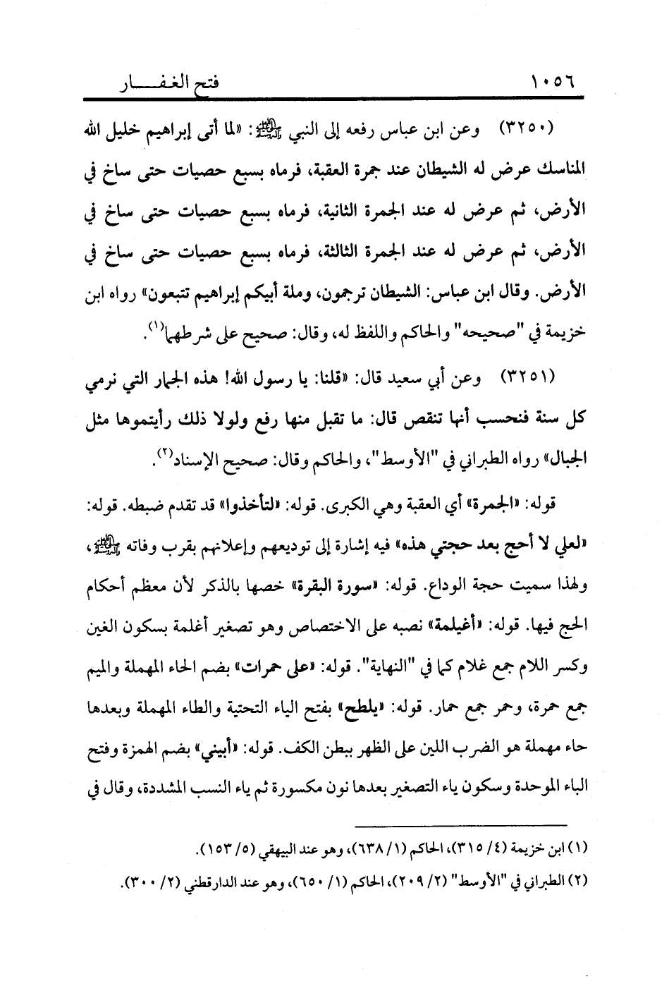 3250 - وعن ابن عباس رفعه إلى النبي - صلى الله عليه وسلم -: «لما أتى إبراهيم خليل الله المناسك عرض له الشيطان عند جمرة العقبة فرماه بسبع حصيات حتى ساخ في الأرض، ثم عرض له عند الجمرة الثانية فرماه بسبع حصيات حتى ساخ في الأرض، ثم عرض له عند الجمرة الثالثة فرماه بسبع حصيات حتى ساخ في الأرض. وقال ابن عباس: الشيطان ترجمون، وملة أبيكم إبراهيم تتبعون» رواه ابن خزيمة في "صحيحه" والحاكم واللفظ له، وقال: صحيح على شرطهما (¬1) .