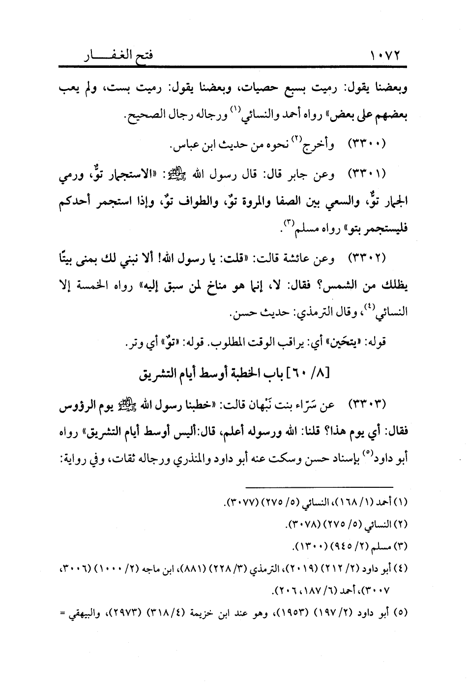 3303 - عن سَرّاء بنت نَبْهان قالت: «خطبنا رسول الله - صلى الله عليه وسلم - يوم الرءوس فقال: أي يوم هذا؟ قلنا الله ورسوله أعلم، قال: أليس أوسط أيام التشريق» رواه أبو داود (¬5) بإسناد حسن وسكت عنه أبو داود والمنذري ورجاله ثقات، وفي رواية: