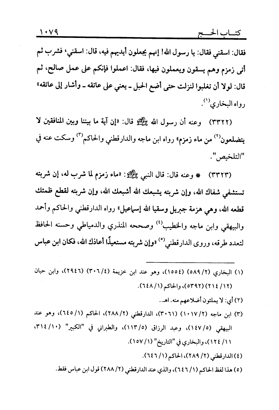 3322 - وعنه أن رسول الله - صلى الله عليه وسلم - قال: «إن آية ما بيننا وبين المنافقين لا يتضلعون (¬2) من ماء زمزم» رواه ابن ماجه والدارقطني والحاكم (¬3) وسكت عنه في "التلخيص".