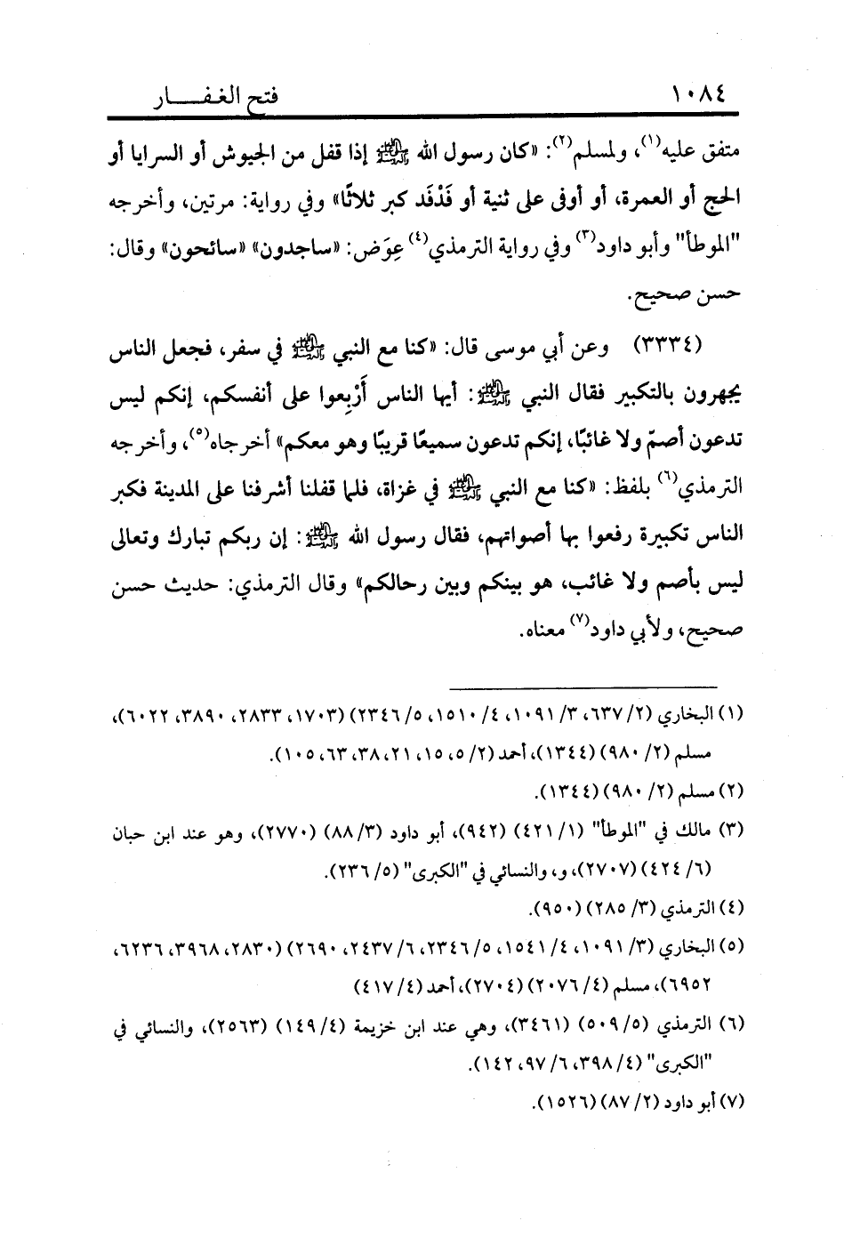 3334 - وعن أبي موسى قال: «كنا مع النبي - صلى الله عليه وسلم - في سفر فجعل الناس يجهرون بالتكبير فقال النبي - صلى الله عليه وسلم -: أيها الناس أَرْبِعوا على أنفسكم إنكم ليس تدعون أصمّ ولا غائبًا، إنكم تدعون سميعًا قريبًا وهو معكم» أخرجاه (¬5) ، وأخرجه الترمذي (¬6) بلفظ: «كنا مع النبي - صلى الله عليه وسلم - في غزاة فلما قفلنا أشرفنا على المدينة فكبر الناس تكبيرة رفعوا بها أصواتهم فقال رسول الله - صلى الله عليه وسلم -: إن ربكم تبارك وتعالى ليس بأصم ولا غائب هو بينكم وبين رحالكم» وقال الترمذي: حديث حسن صحيح، ولأبي داود (¬7) معناه.
