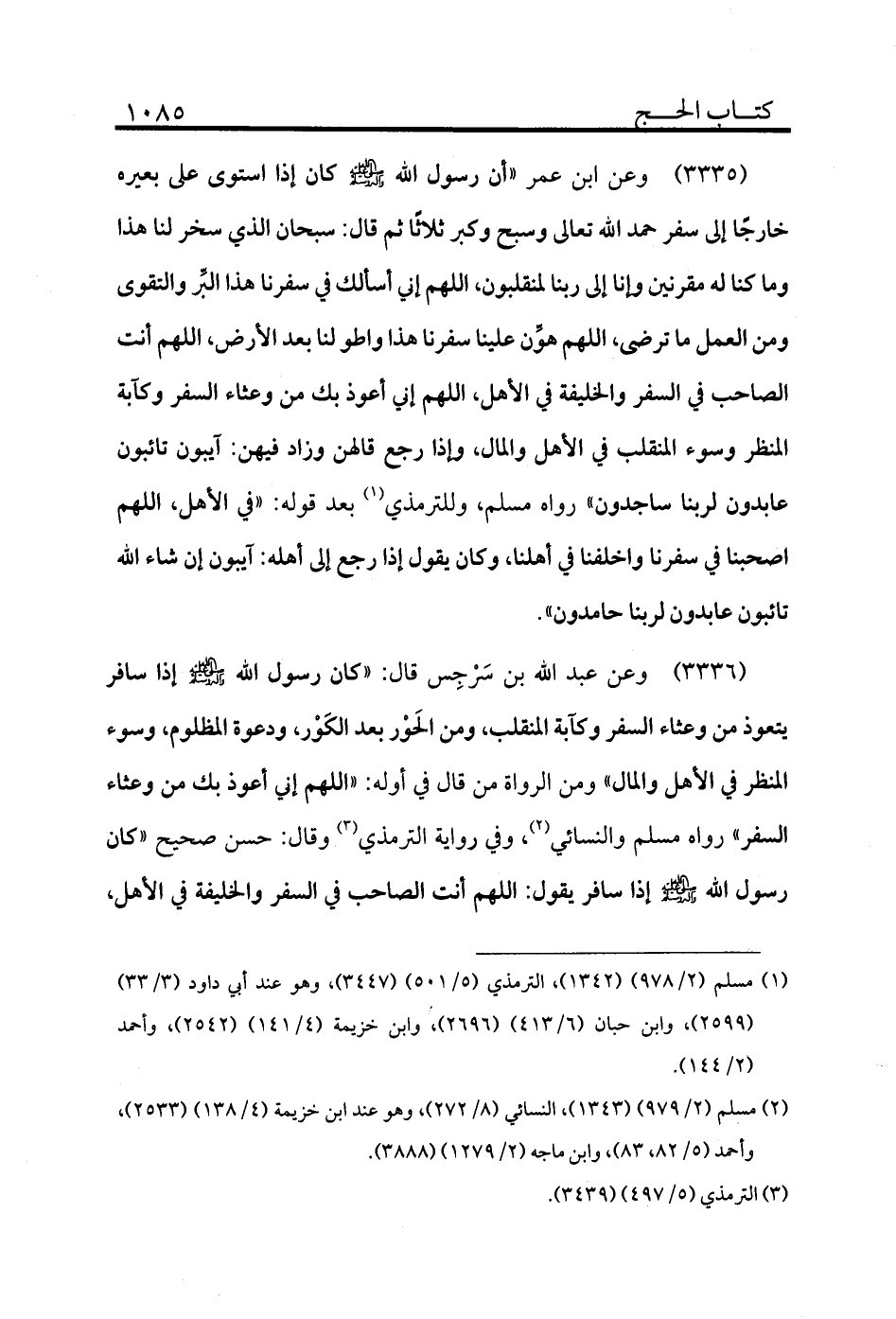 3335 - وعن ابن عمر «أن رسول الله - صلى الله عليه وسلم - كان إذا استوى على بعيره خارجًا إلى سفر حمد الله تعالى وسبح وكبر ثلاثًا ثم قال: سبحان الذي سخر لنا هذا وما كنا له مقرنين وإنا إلى ربنا لمنقلبون، اللهم إني أسألك في سفرنا هذا البِّر والتقوى ومن العمل ما ترضى، اللهم هوِّن علينا سفرنا هذا واطو لنا بعد الأرض، اللهم أنت الصاحب في السفر والخليفة في الأهل، اللهم إني أعوذ بك من وعثاء السفر وكآبة المنظر وسوء المنقلب في الأهل والمال وإذا رجع قالهن وزاد فيهن آيبون تائبون عابدون لربنا ساجدون» رواه مسلم والترمذي (¬1) بعد قوله: «في الأهل، اللهم أصحِبنا في سفرنا واخلفنا في أهلنا وكان يقول إذا رجع إلى أهله آيبون إن شاء الله تائبون عابدون لربنا حامدون» .