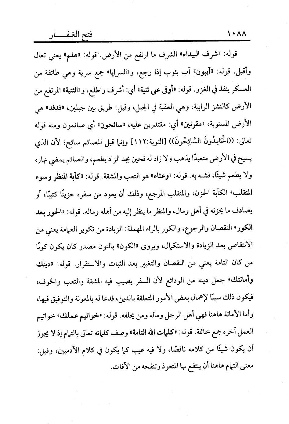 قوله: «شرف البيدا» الشرف ما ارتفع من الأرض. قوله: «هلم» يعني تعال وأقبل. قوله: «آيبون» آب يئوب إذا رجع والسرايا جمع سرية وهي طائفة من العسكر ينفذ في الغزو. قوله: «أوفى على ثنية» أي: أشرف وأطلع، والثنية المرتفع من الأرض كالنشز الرابية، وهي العقبة في الجبل، وقيل: طريق بين جبلين، فدفد هي الأرض المستوية «مقرنين» أي: مقتدرين عليه سائحون أي صائمون ومنه قوله تعالى: ((الْحَامِدُونَ السَّائِحُونَ)) [التوبة:112] وإنما قيل للصائم سائح؛ لأن الذي يسيح في الأرض متعبدًا يذهب ولا زاد له فحين يجد الزاد يطعم والصائم يمضي نهاره ولا يطعم شيئًا فشبه به. قوله: «وعثًا» هو التعب والمشقة. قوله: «كآبة المنظر وسوء المنقلب» الكآبة الحزن، والمنقلب المرجع وذلك أن يعود من سفره حزينًا كئيبًا، أو يصادف ما يحزنه في أهل ومال، والمنظر من أهله وماله. قوله: «الحور بعد الكور» الحور النقصان، والكور بالراء المهلمة: الزيادة من تكوير العمامة يعني من الانتقاص بعد الزيادة والاستكمال ويروى الكون بالنون مصدر كان يكون كونًا من كان التامة أي التغيير بعد الثبات والاستقرار. قوله: «دينك وأمانتك» جعل دينه من الودائع لأن السفر يصيب فيه المشقة والتعب والخوف فيكون ذلك سببًا لإهمال بعض الأمور المتعلقة بالدين فدعا له بالمعونة والتوفيق فيها، وأما الأمانة هاهنا فهي أهل الرجل وماله ومن يخلفه. قوله: «خواتيم عملك» خواتيم العمل آخره جمع خاتمة. قوله: «كلمات الله التامة» وصف كلماته تعالى بالتمام إذ لا يجوز أن يكون شيئًا من كلامه ناقصًا، ولا فيه عيب كما يكون في كلام الآدميين وقيل معنى التمام هاهنا أن ينتفع بها المتعوذ من الآفات.