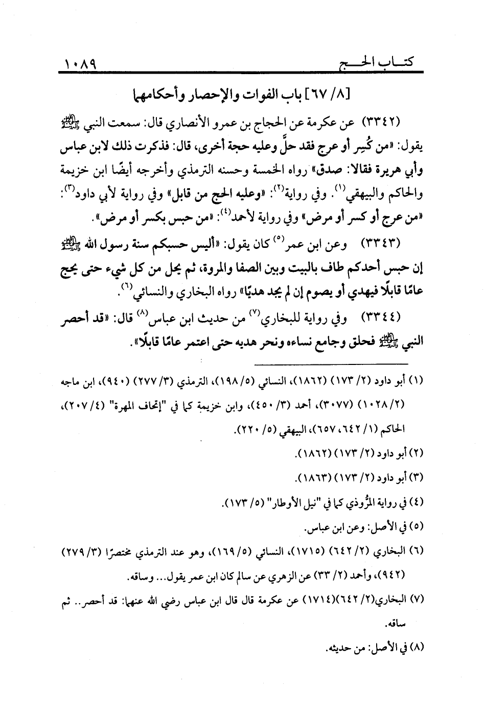 3342 - عن عكرمة عن الحجاج بن عمرو الأنصاري قال: سمعت النبي - صلى الله عليه وسلم - يقول: «من كسر أو عرج فقد حل وعليه حجة أخرى، قال: فذكرت ذلك لابن عباس وأبي هريرة فقالا: صدق» رواه الخمسة وحسنه الترمذي وأخرجه أيضًا ابن خزيمة والحاكم والبيهقي (¬1) . وفي رواية (¬2) : «وعليه الحج من قابل» وفي رواية لأبي داود (¬3) : «من عرج أو كسر أو مرض» وفي رواية لأحمد (¬4) : «من حبس بكسر أو مرض» .