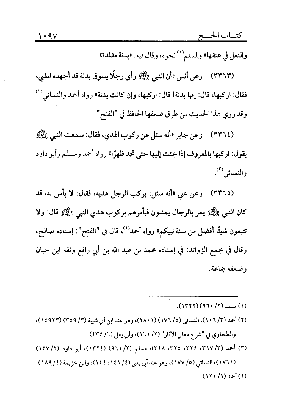 3365 - وعن علي «أنه سئل يركب الرجل هديه، فقال: لا بأس به قد كان النبي - صلى الله عليه وسلم - يمر بالرجال يمشون فيأمرهم بركوب هدي النبي - صلى الله عليه وسلم - قال: ولا تتبعون شيئًا أفضل من سنة نبيكم» رواه أحمد (¬4) ، قال في "الفتح": إسناده صالح، وقال في مجمع الزوائد: في إسناده محمد بن عبد الله بن أبي رافع وثقه ابن حبان وضعفه جماعة.