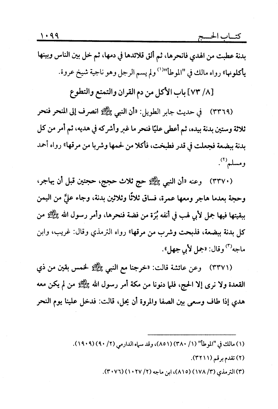 3370 - وعنه «أن النبي - صلى الله عليه وسلم - حج ثلاث حجج، حجتين قبل أن يهاجر وحجة بعدما هاجر ومعها عمرة فساق ثلاثًا وثلاثين بدنة، وجاء عليَّ من اليمن ببقيتها فيها جمل لأبي لهب في أنفه بُرَة من فضة فنحرها، وأمر رسول الله - صلى الله عليه وسلم - من كل بدنة ببضعة فذبحت وشرب من مرقها» رواه الترمذي وقال: غريب، وابن ماجه (¬3) وقال: «جمل لأبي جهل» .