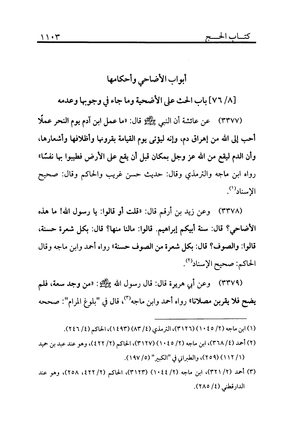 3378 - وعن زيد بن أرقم قال: «قلت أو قالوا: يا رسول الله! ما هذه الأضاحي؟ قال: سنة أبيكم إبراهيم. قالوا: مالنا منها؟ قال: بكل شعرة حسنة، قالوا: والصوف؟ قال: بكل شعرة من الصوف حسنة» رواه أحمد وابن ماجه وقال الحاكم: صحيح الإسناد (¬2) .