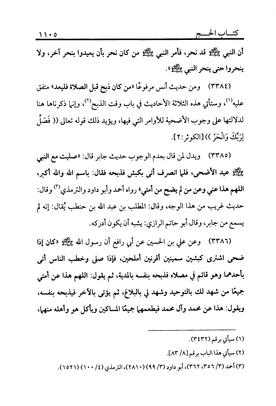 3384 - ومن حديث أنس مرفوعًا «من كان ذبح قبل الصلاة فليعد» متفق عليه (¬1) وستأتي هذه الثلاثة الأحاديث في باب وقت الذبح (¬2) وإنما ذكرناها هنا لدلالتها على وجوب الأضحية للأوامر التي فيها ويؤيد ذلك قوله تعالى ((فَصَلِّ لِرَبِّكَ وَانْحَرْ)) [الكوثر:2] .