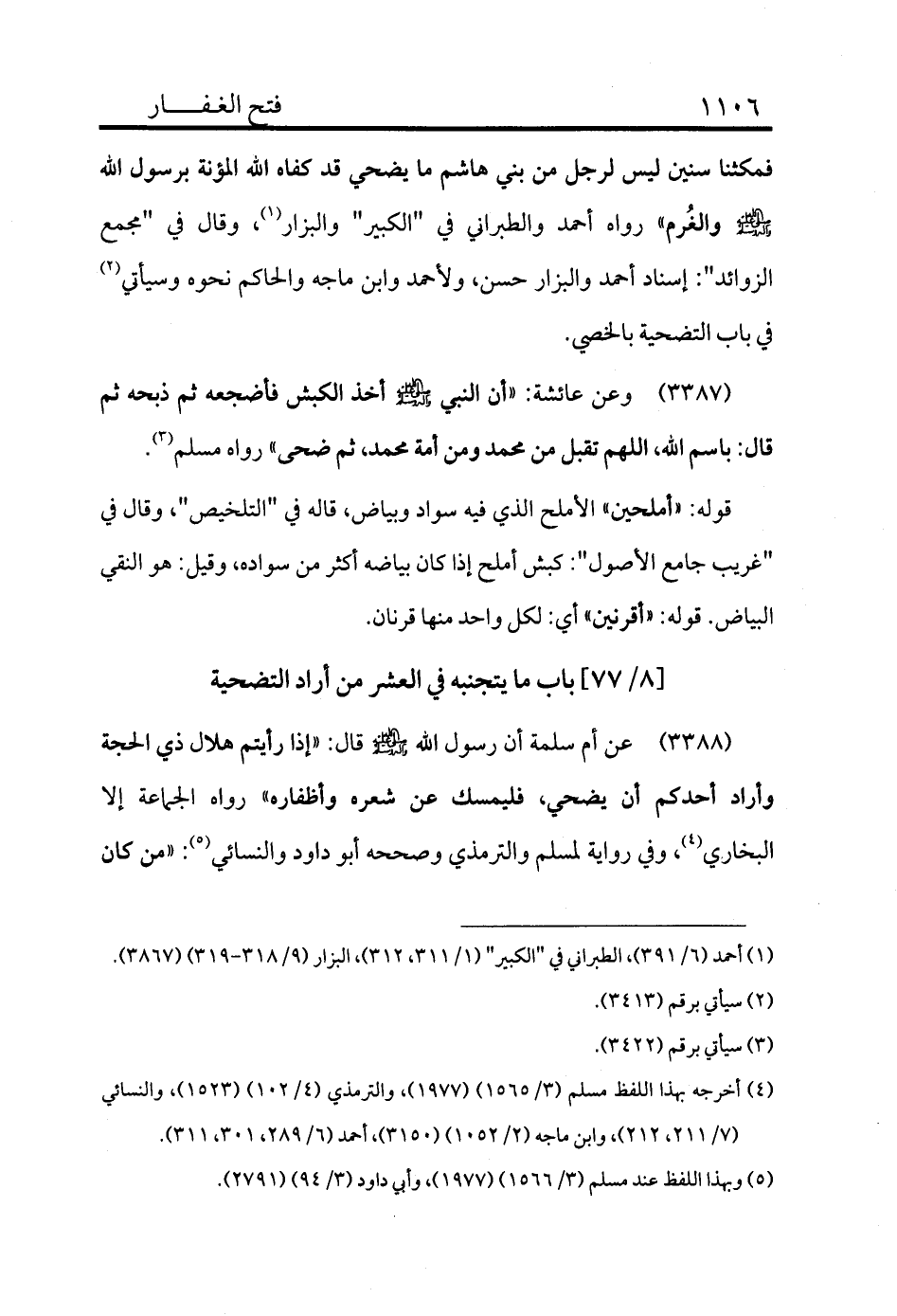 3388 - عن أم سلمة أن رسول الله - صلى الله عليه وسلم - قال: «إذا رأيتم هلال ذي الحجة وأراد أحدكم أن يضحي، فليمسك عن شعره وأظفاره» رواه الجماعة إلا البخاري (¬4) ، وفي رواية لمسلم والترمذي وصححه أبو داود والنسائي (¬5) : «من كان