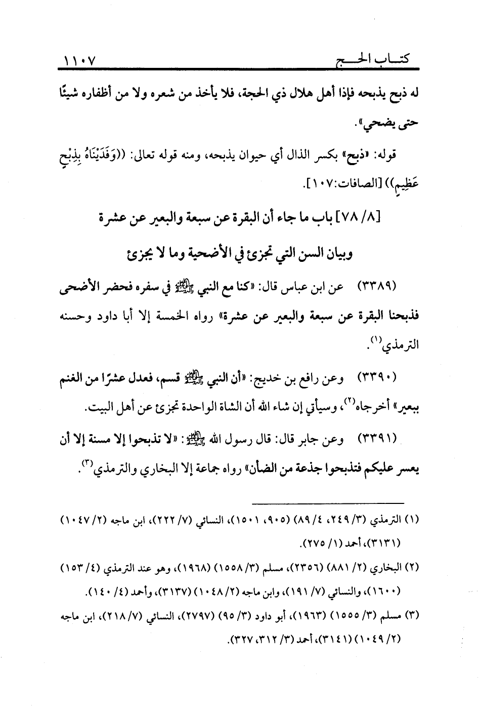 3391 - وعن جابر قال: قال رسول الله - صلى الله عليه وسلم -: «لا تذبحوا إلا مسنة إلا أن يعسر عليكم فتذبحوا جذعة من الضأن» رواه جماعة إلا البخاري والترمذي (¬3) .