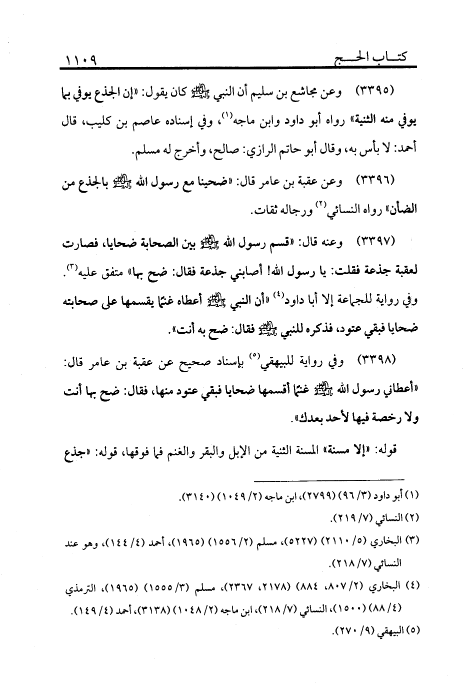 3396 - وعن عقبة بن عامر قال: «ضحينا مع رسول الله - صلى الله عليه وسلم - بالجذع من الضأن» رواه النسائي (¬2) ورجاله ثقات.