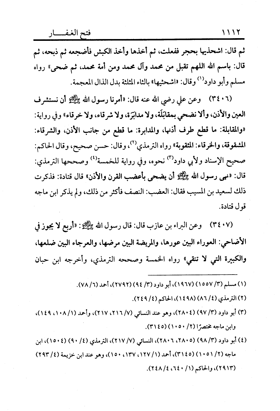 3406 - وعن علي رضي الله عنه قال: «أمرنا رسول الله - صلى الله عليه وسلم - أن نستشرف العين والأذن وألا نضحي بمقابَلَة ولا مدابَرَة ولا شرقاء ولا خرقاء» وفي رواية: «والمقابلة ما قطع طرف أذنها والمدابرة ما قطع من جانب الأذن والشرقاء المشقوقة والخرقاء المثقوبة» رواه الترمذي (¬2) ، وقال: حسن صحيح، وقال الحاكم: صحيح الإسناد ولأبي داود (¬3) نحوه، وفي رواية للخمسة (¬4) وصححها الترمذي: قال: «نهى رسول الله - صلى الله عليه وسلم - أن يضحى بأعضب القرن والأذن» قال قتادة: فذكرت ذلك لسعيد بن المسيب فقال: العضب: النصف فأكثر من ذلك ولم يذكر ابن ماجه قول قتادة.