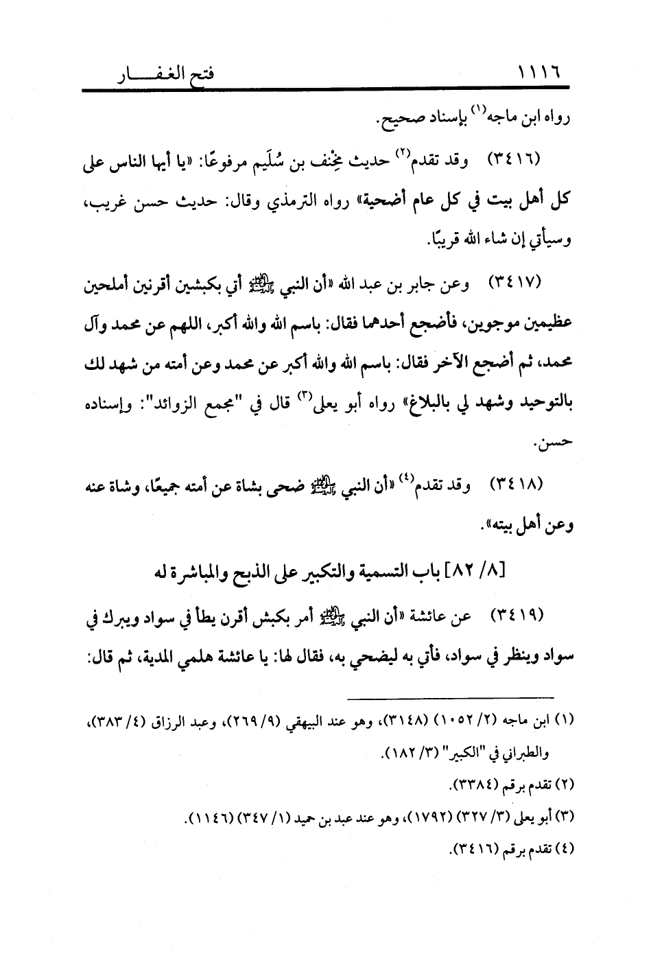 3416 - وقد تقدم (¬2) حديث مِخْنف بن سُلَيم مرفوعًا: «يا أيها الناس على كل أهل بيت في كل عام أضحية» رواه الترمذي وقال: حديث حسن غريب، وسيأتي إن شاء الله قريبًا.