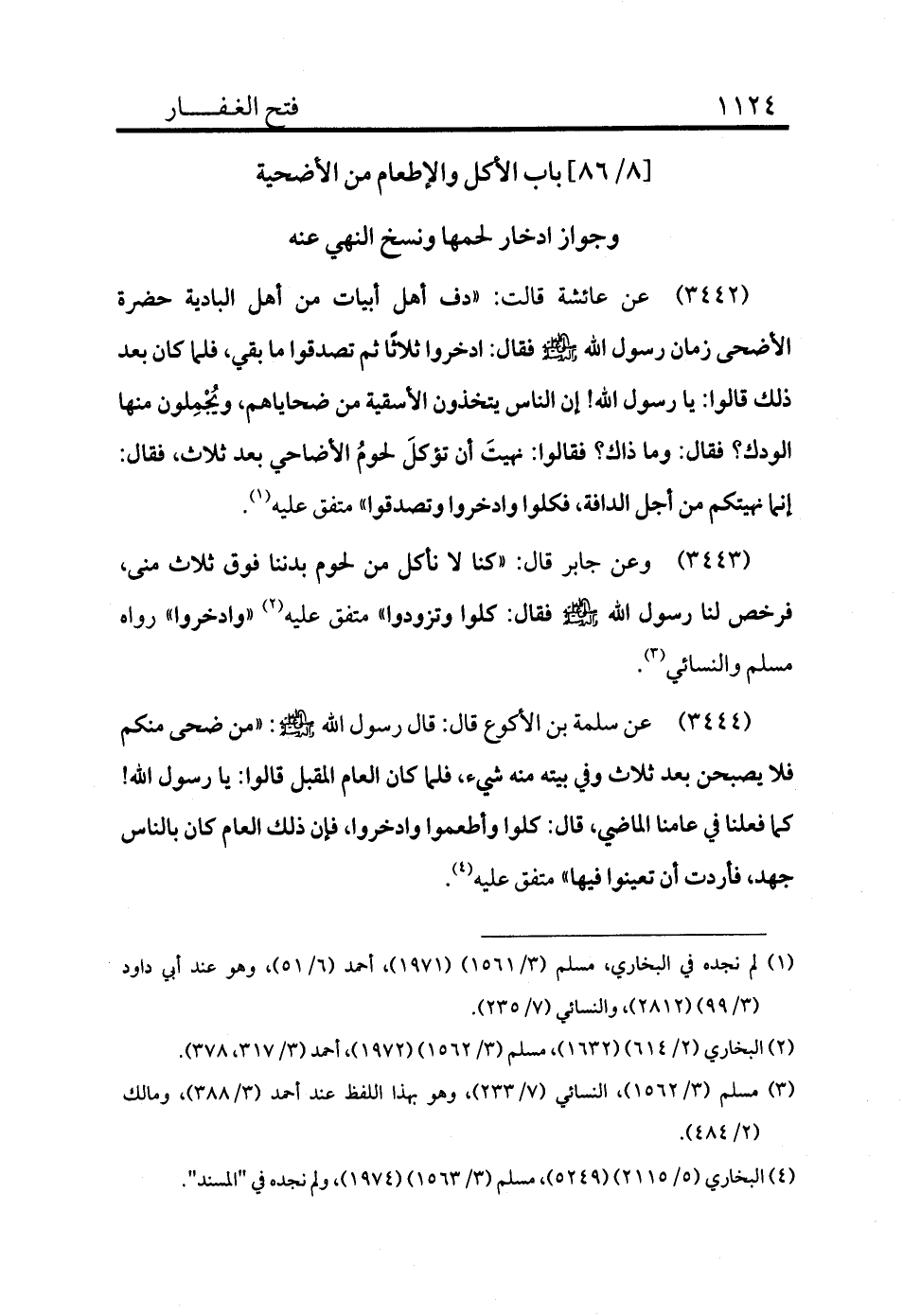3444 - عن سلمة بن الأكوع قال: قال رسول الله - صلى الله عليه وسلم -: «من ضحى منكم فلا يصبحن بعد ثلاث وفي بيته منه شيء، فلما كان العام المقبل قالوا: يا رسول الله! كما فعلنا في عامنا الماضي، قال: كلوا وأطعموا وادخروا، فإن ذلك العام كان بالناس جهد، فأردت أن تعينوا فيها» متفق عليه (¬4) .