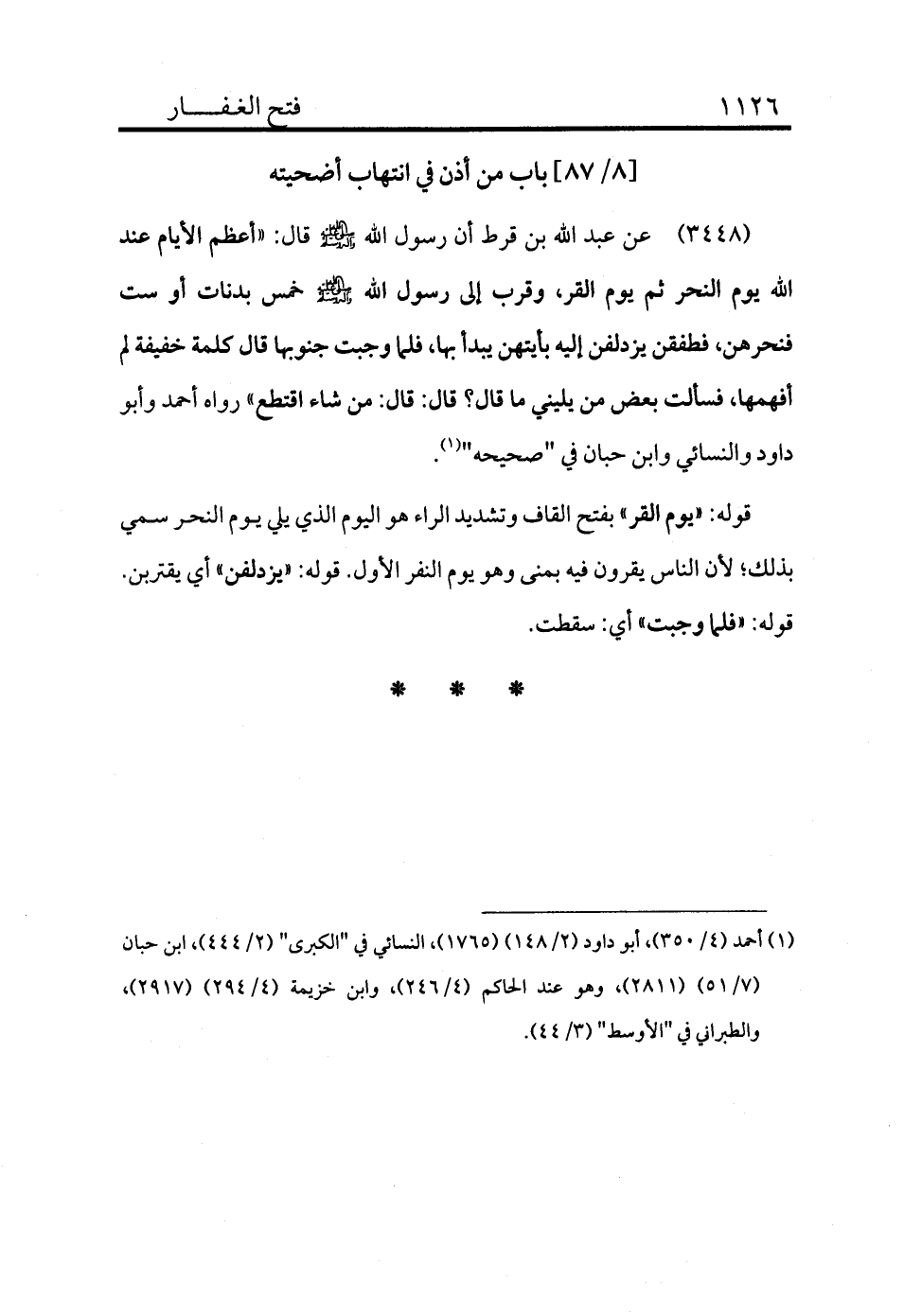 3448 - عن عبد الله بن قرط أن رسول الله - صلى الله عليه وسلم - قال: «أعظم الأيام عند الله يوم النحر ثم يوم القر وقرب إلى رسول الله - صلى الله عليه وسلم - خمس بدنات أو ست فنحرهن فطفقن يزدلفن إليه بأيتهن يبدأ بها فلما وجبت جنوبها قال كلمة خفيفة لم أفهمها فسألت بعض من يليني ما قال؟ قال: قال: من شاء اقتطع» رواه أحمد وأبو داود والنسائي وابن حبان في "صحيحه" (¬1) .