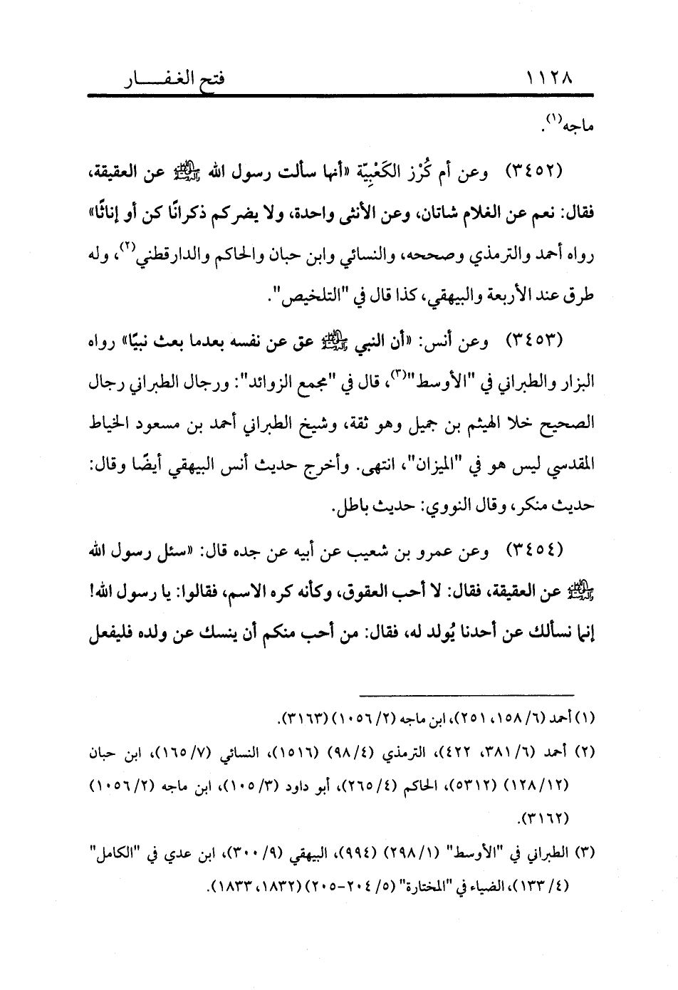 3453 - وعن أنس: «أن النبي - صلى الله عليه وسلم - عق عن نفسه بعدما بعث نبيًا» رواه البزار والطبراني في "الأوسط" (¬3) ، قال في "مجمع الزوائد": ورجال الطبراني رجال الصحيح خلا الهيثم بن جميل وهو ثقة، وشيخ الطبراني أحمد بن مسعود الخياط المقدسي ليس هو في "الميزان"، انتهى. وأخرج حديث أنس البيهقي أيضًا وقال: حديث منكر، وقال النووي: حديث باطل.