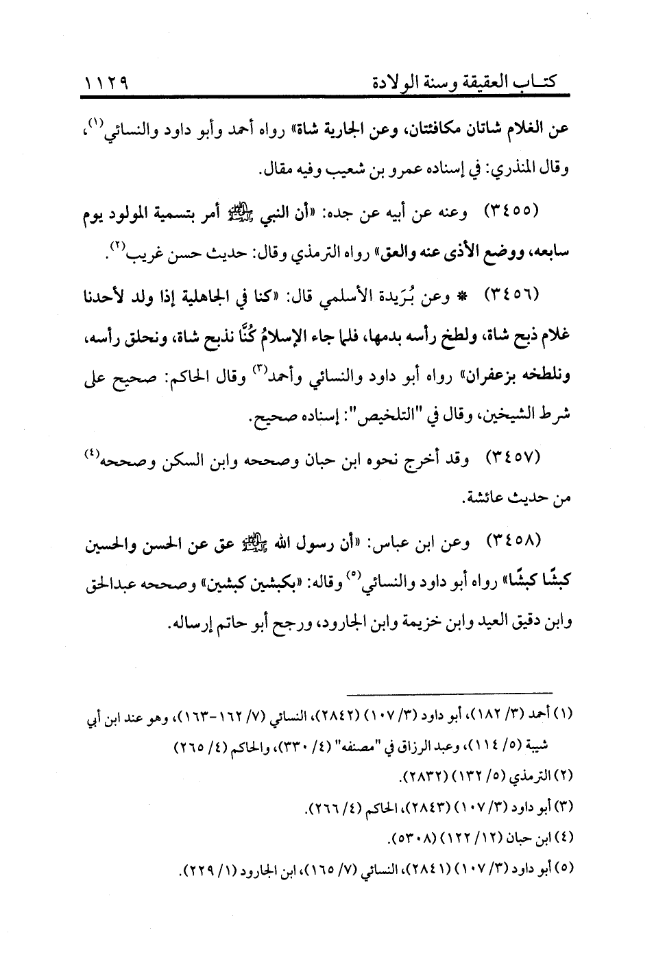 3456 - وعن بُرَيدة الأسلمي قال: «كنا في الجاهلية إذا ولد لأحدنا غلام ذبح شاة، ولطخ رأسه بدمها، فلما جاء الإسلامُ كُنَّا نذبح شاة، ونحلق رأسه، ونلطخه بزعفران» رواه أبو داود والنسائي وأحمد (¬3) (*) وقال الحاكم: صحيح على شرط الشيخين، وقال في "التلخيص": إسناده صحيح.