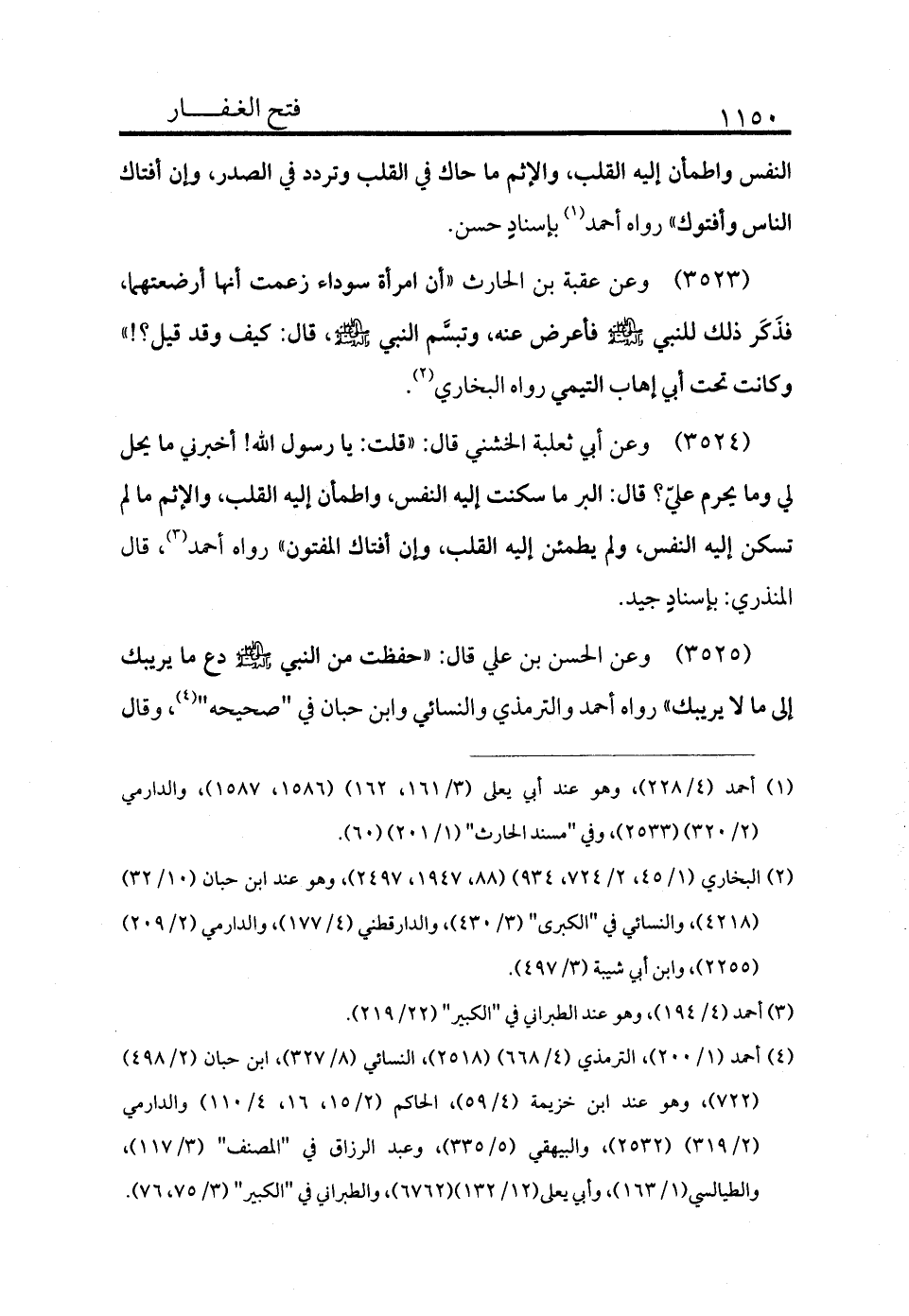 3524 - وعن أبي ثعلبة الخشني قال: «قلت: يا رسول الله! أخبرني ما يحل لي وما يحرم علي؟ قال: البر ما سكنت إليه النفس، واطمأن إليه القلب، والإثم ما لم تسكن إليه النفس، ولم يطمئن إليه القلب، وإن أفتاك المفتون» رواه أحمد (¬3) ، قال المنذري: بإسناد جيد.