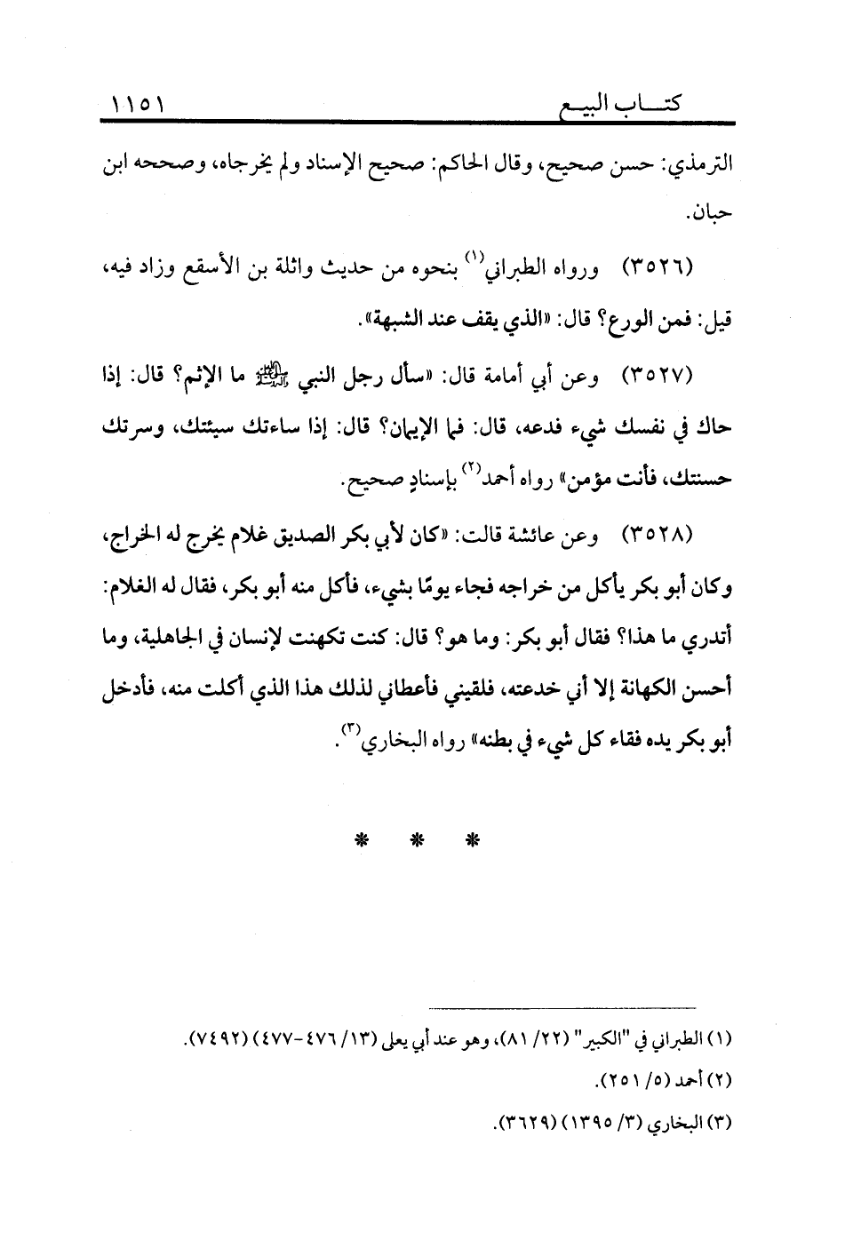 3527 - وعن أبي أمامة قال: «سأل الرجل النبي - صلى الله عليه وسلم - ما الإثم؟ قال: إذا حاك في نفسك شيء فدعه، قال: فما الإيمان؟ قال إذا ساءتك سيئتك، وسرتك حسنتك، فأنت مؤمن» رواه أحمد (¬2) بإسناد صحيح.