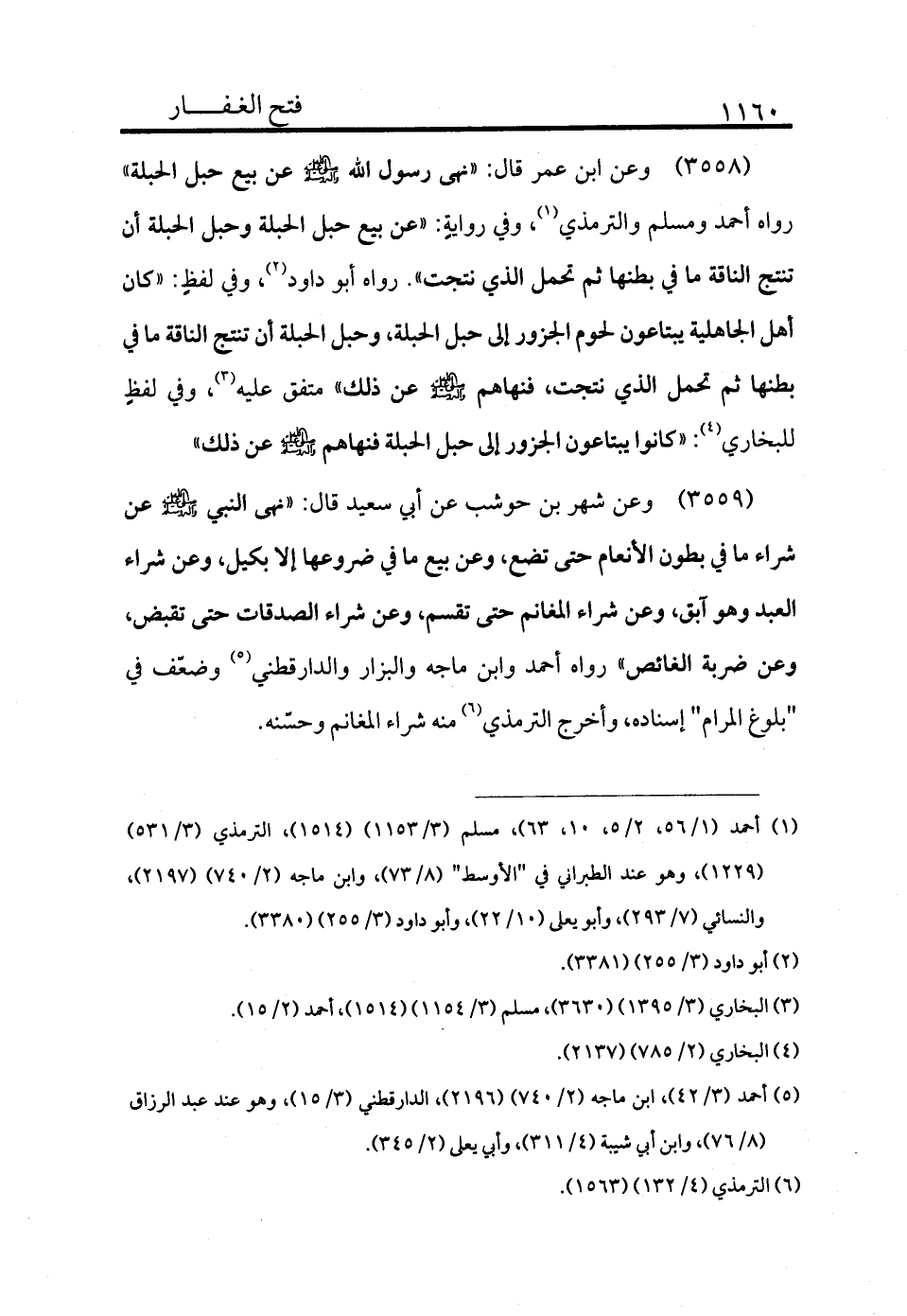 3558 - وعن ابن عمر قال: «نهى رسول الله - صلى الله عليه وسلم - عن بيع حبل الحبلة» رواه أحمد ومسلم والترمذي (¬1) ، وفي رواية: «عن بيع حبل الحبلة وحبل الحبلة أن تنتج الناقة ما في بطنها ثم تحمل الذي نتجت» . رواه أبو داود (¬2) وفي لفظ: «كان أهل الجاهلية يبتاعون لحوم الجزر إلى حبل الحبلة، وحبل الحبلة أن تنتج الناقة ما في بطنها ثم تحمل الذي نتجت، فنهاهم - صلى الله عليه وسلم - عن ذلك» متفق عليه (¬3) ، وفي لفظ البخاري (¬4) : «كانوا يبتاعون الجزور إلى حبل الحبلة فنهاهم - صلى الله عليه وسلم - عن ذلك»