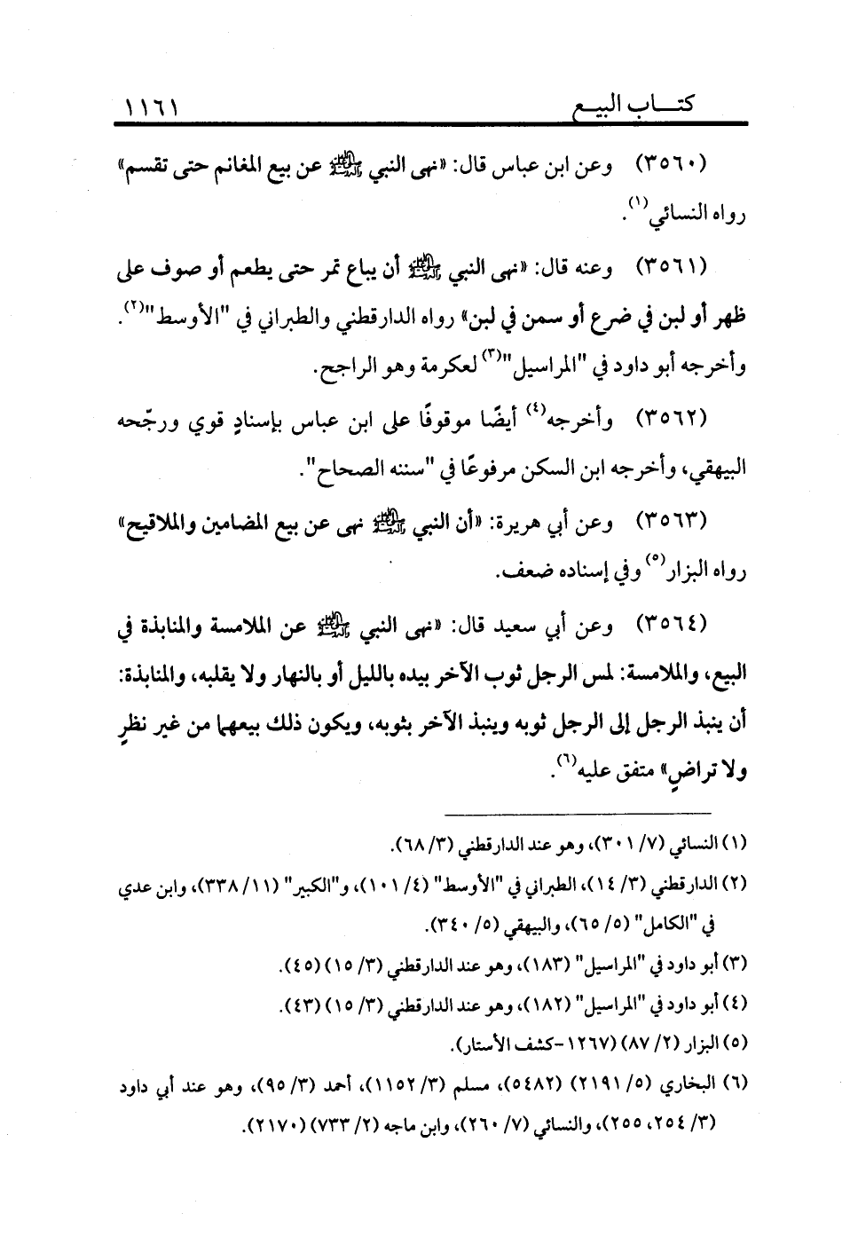 3560 - وعن ابن عباس قال: «نهى النبي - صلى الله عليه وسلم - عن بيع المغانم حتى تقسم» رواه النسائي (¬1) .