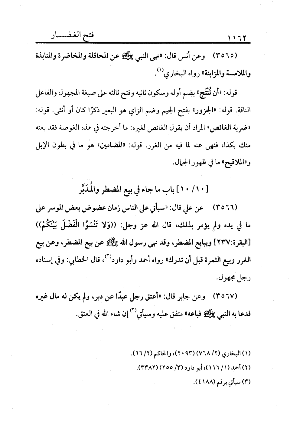 3567 - وعن جابر قال: «أعتق رجل عبدًا عن دبر، ولم يكن له مال غيره فدعا به النبي - صلى الله عليه وسلم - فباعه» متفق عليه وسيأتي (¬3) إن شاء الله في العتق.
