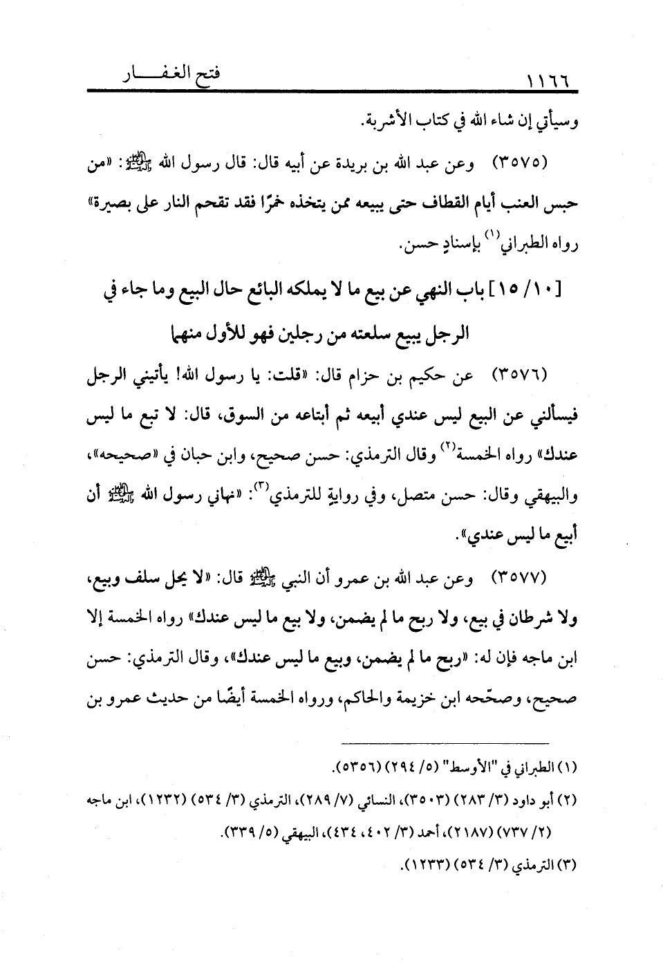 3577 - وعن عبد الله بن عمرو أن النبي - صلى الله عليه وسلم - قال: «لا يحل سلف وبيع، ولا شرطان في بيع، ولا ربح ما لم يضمن، ولا بيع ما ليس عندك» رواه الخمسة إلا ابن ماجه فإن له «ربح ما لم يضمن، وبيع ما ليس عندك» وقال الترمذي: حسن صحيح وصححه ابن خزيمة والحاكم ورواه الخمسة أيضًا من حديث عمرو بن