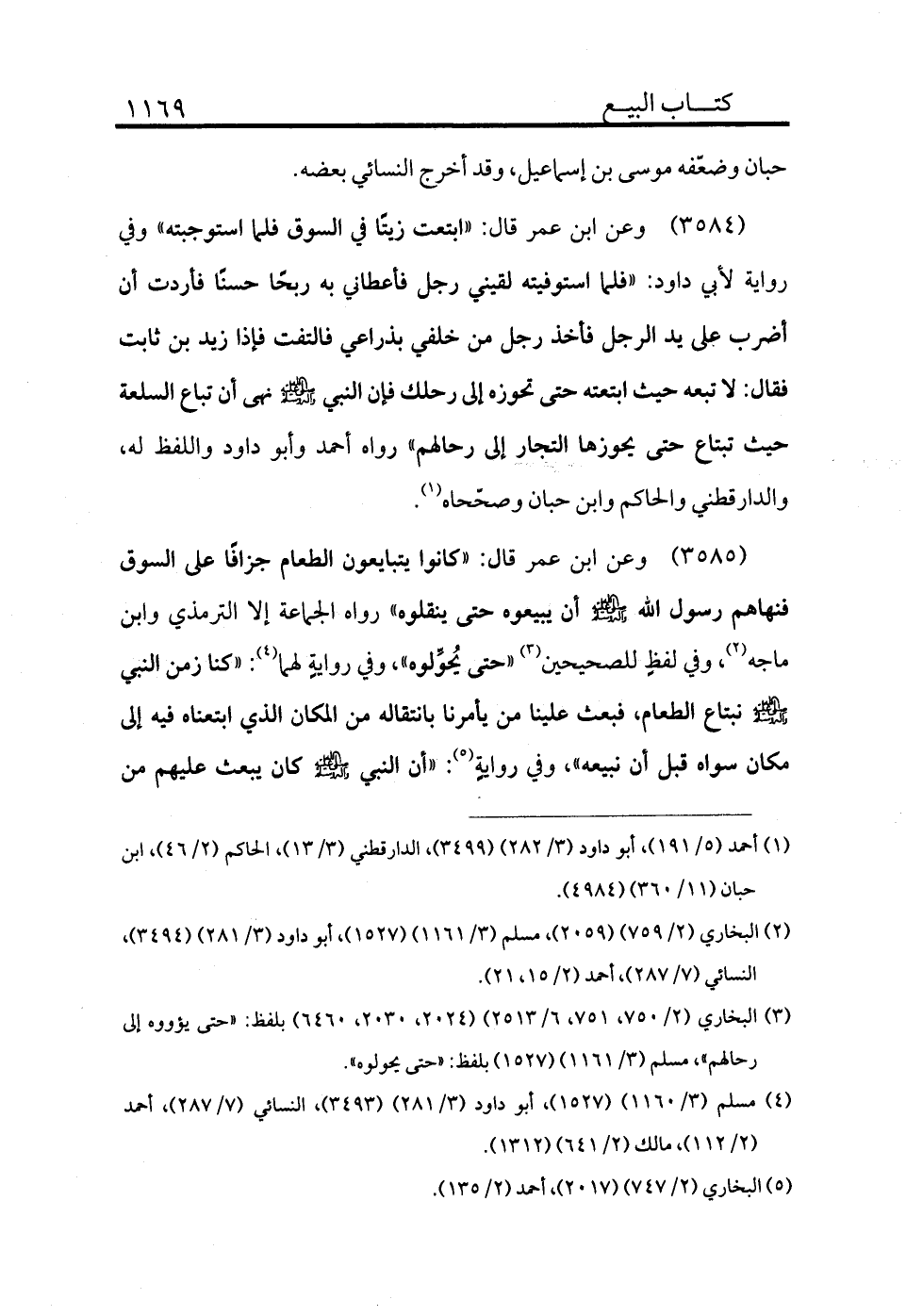 3584 - وعن ابن عمر قال: «ابتعت زيتًا في السوق فلما استوجبته» وفي رواية لأبي داود: «فلما استوفيته لقيني رجل فأعطاني به ربحًا حسنًا فأردت أن أضرب على يد الرجل فأخذ رجل من خلفي بذراعي فالتفت فإذا زيد بن ثابت فقال: لا تبعه حيث ابتعته حتى تحوزه إلى رحلك فإن النبي - صلى الله عليه وسلم - نهى أن تباع السلعة حيث تبتاع حتى يحوزها التجار إلى رحالهم» رواه أحمد وأبو داود واللفظ له، والدارقطني والحاكم وابن حبان وصححاه (¬1) .