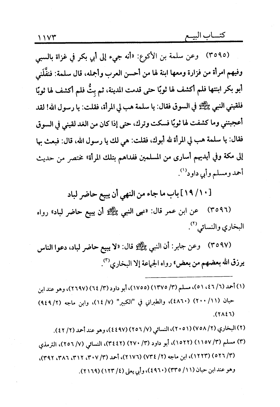 3596 - عن ابن عمر قال: «نهى النبي - صلى الله عليه وسلم - أن يبيع حاضر لباد» رواه البخاري والنسائي (¬2) .