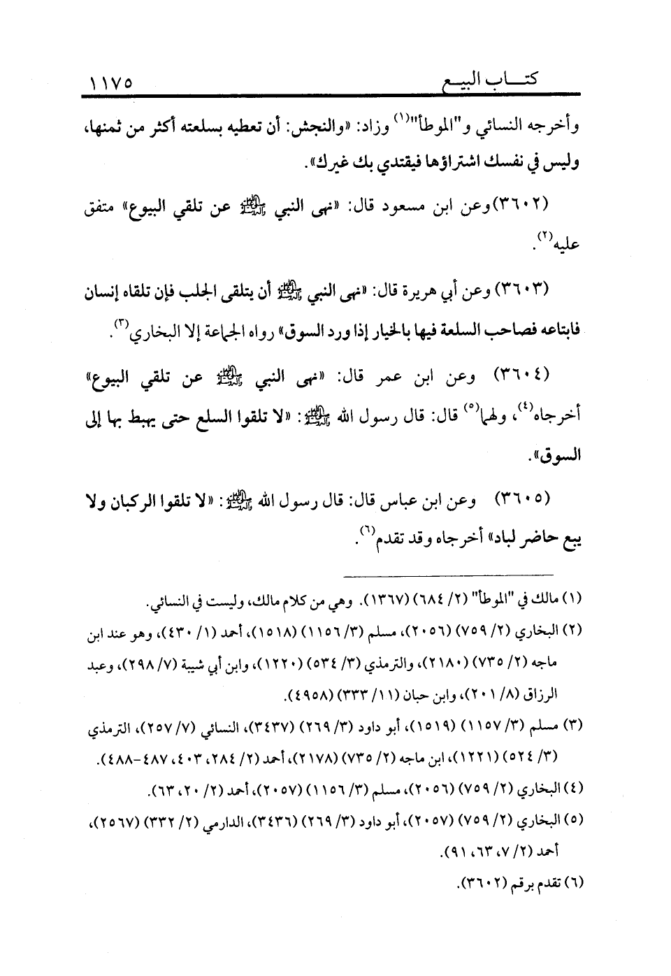 3602 - وعن ابن مسعود قال: «نهى النبي - صلى الله عليه وسلم - عن تلقي البيوع» متفق عليه (¬2) .