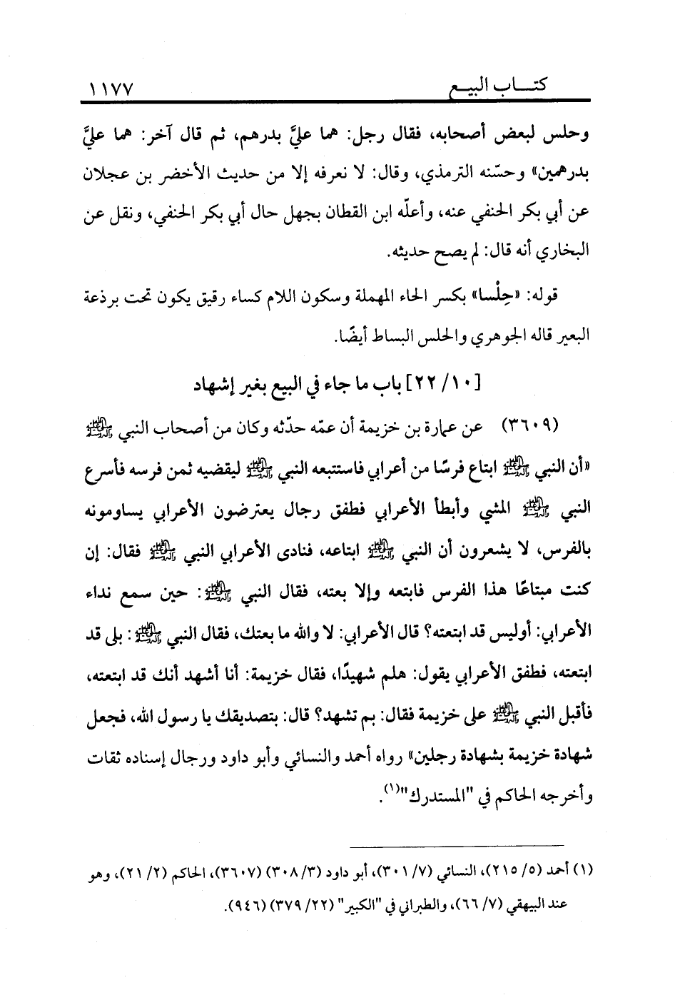 3609 - عن عمارة بن خزيمة أن عمه حدثه وكان من أصحاب النبي - صلى الله عليه وسلم - «أنه ابتاع فرسًا من أعرابي فاستتبعه النبي - صلى الله عليه وسلم - ليقض ثمن فرسه فأسرع النبي - صلى الله عليه وسلم - المشي وأبطأ الأعرابي فطفق رجال يعترضون الأعرابي يسامونه بالفرس، لا يشعرون أن النبي - صلى الله عليه وسلم - ابتاعه، فنادى الأعرابي النبي - صلى الله عليه وسلم - فقال: إن كنت مبتاعًا هذا الفرس فابتعه وإلا بعته، فقال النبي - صلى الله عليه وسلم -: حين سمع نداء الأعرابي: أوليس قد ابتعته؟ قال الأعرابي: لا والله ما بعتك، فقال النبي - صلى الله عليه وسلم -: بلى قد ابتعته، فطفق الأعرابي يقول: هلم شهيدًا، فقال خزيمة: أنا أشهد أنك قد ابتعته، فأقبل النبي - صلى الله عليه وسلم - على خزيمة بم تشهد؟ قال: بتصديقك يا رسول الله، فجعل شهادة خزيمة بشهادة رجلين» رواه أحمد والنسائي وأبو داود ورجال إسناده ثقات وأخرجه الحاكم في "المستدرك" (¬1) .