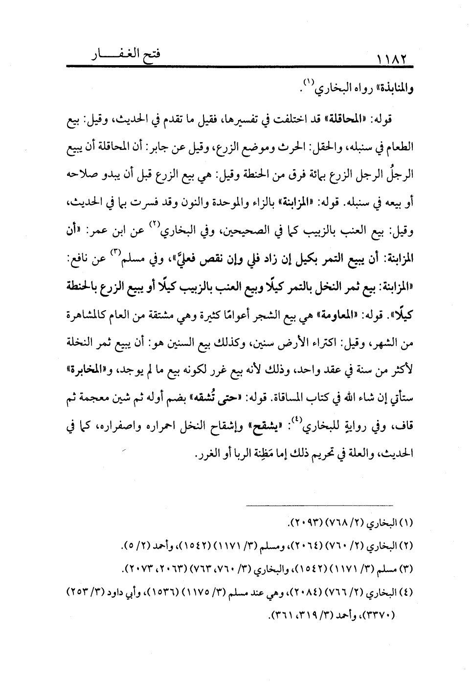 قوله: «المحاقلة» قد اختلفت في تفسيرها فقيل ما تقدم في الحديث وقيل بيع الطعام في سنبله والحقل الحرث وموضع الزرع وقيل عن جابر أن المحاقلة أن يبيع الرجل الرجل الزرع بمائة فرق من الحنطة وقيل هو بيع الزرع قبل أن يبدو صلاحه أو بيعه في سنبله. قوله: «المزابنة» بالزاء والموحدة والنون وقد فسرت بما في الحديث وقيل بيع العنب بالزبيب كما في الصحيحين، وفي البخاري (¬2) عن ابن عمر «أن المزابنة أن يبيع التمر بكيل إن زاد فلي وإن نقص فعلي» وفي مسلم (¬3) عن نافع: «المزابنة بيع ثمر النخل بالتمر كيلًا وبيع العنب بالزبيب كيلًا أو يبيع الزرع بالحنطة كيلًا» . قوله «المعاومة» هي بيع الشجر أعوامًا كثيرة وهي مشتقة من العام كالمشاهرة من الشهر وقيل اكترى الأرض سنين وكذلك بيع السنين هو أن يبيع ثمر النخل لأكثر من سنة في عقد واحد، وذلك لأنه بيع غرر لكونه بيع ما لم يوجد، والمخابرة ستأتي إن شاء الله تعالى في كتاب المساقاة. قوله: «حتى يشقه» بضم أوله ثم شين معجمة ثم قاف، وفي رواية للبخاري (¬4) : «يشقح» واشقاح النخل احمراره واصفراره، كما في الحديث والعلة في تحريم ذلك أما مظنة الربا أو الغرر.