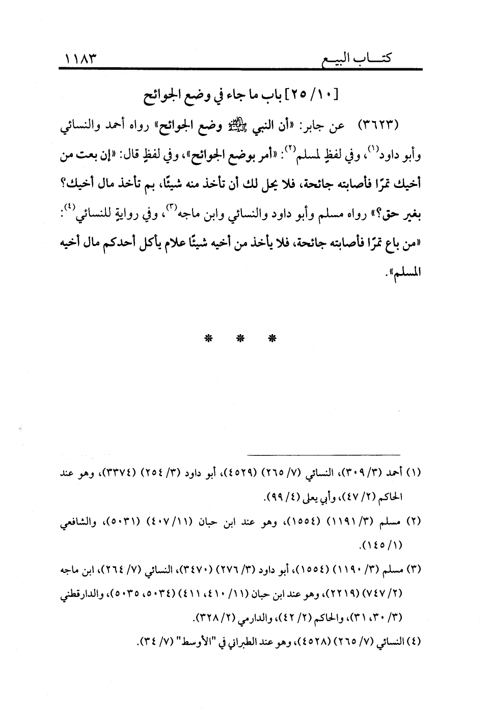 3623 - عن جابر: «أن النبي - صلى الله عليه وسلم - وضع الجوائح» رواه أحمد والنسائي وأبو داود (¬1) ، وفي لفظ لمسلم (¬2) : «أمر بوضع الجوائح» وفي لفظ قال: «إن بعت من أخيك تمرًا فأصابته جائحة، فلا يحل لك أن تأخذ منه شيئًا، بم تأخذ مال أخيك بغير حق؟» رواه مسلم وأبو داود والنسائي وابن ماجه (¬3) ، وفي رواية للنسائي (¬4) : «من باع تمرًا فأصابته جائحة، فلا يأخذ من أخيه شيئًا علام يأكل أحدكم مال أخيه المسلم» .